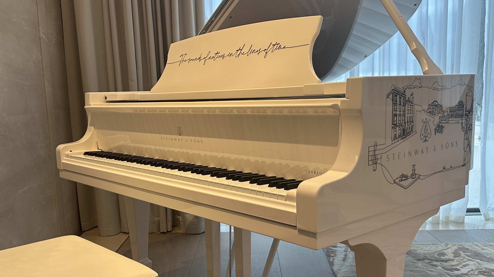 Στο αναλόγιο του πιάνου, ο καλλιτέχνης επέλεξε να αποτυπώσει τη φράση “The sound of nations in the lines of time”, δηλαδή “ο ήχος των εθνών στις γραμμές του χρόνου”, σε μία ενιαία, συνεχή γραμμή, επιδιώκοντας να αναδείξει τη μουσική ως φορέα πολιτισμού και ταυτότητας. Στην ουσία, το πιάνο μεταφέρει το μήνυμα ότι η μουσική δεν είναι στιγμιαία αλλά συσσωρευμένος χρόνος και ο πιανίστας δεν είναι απλός εκτελεστής αλλά φορέας πολιτισμού!
