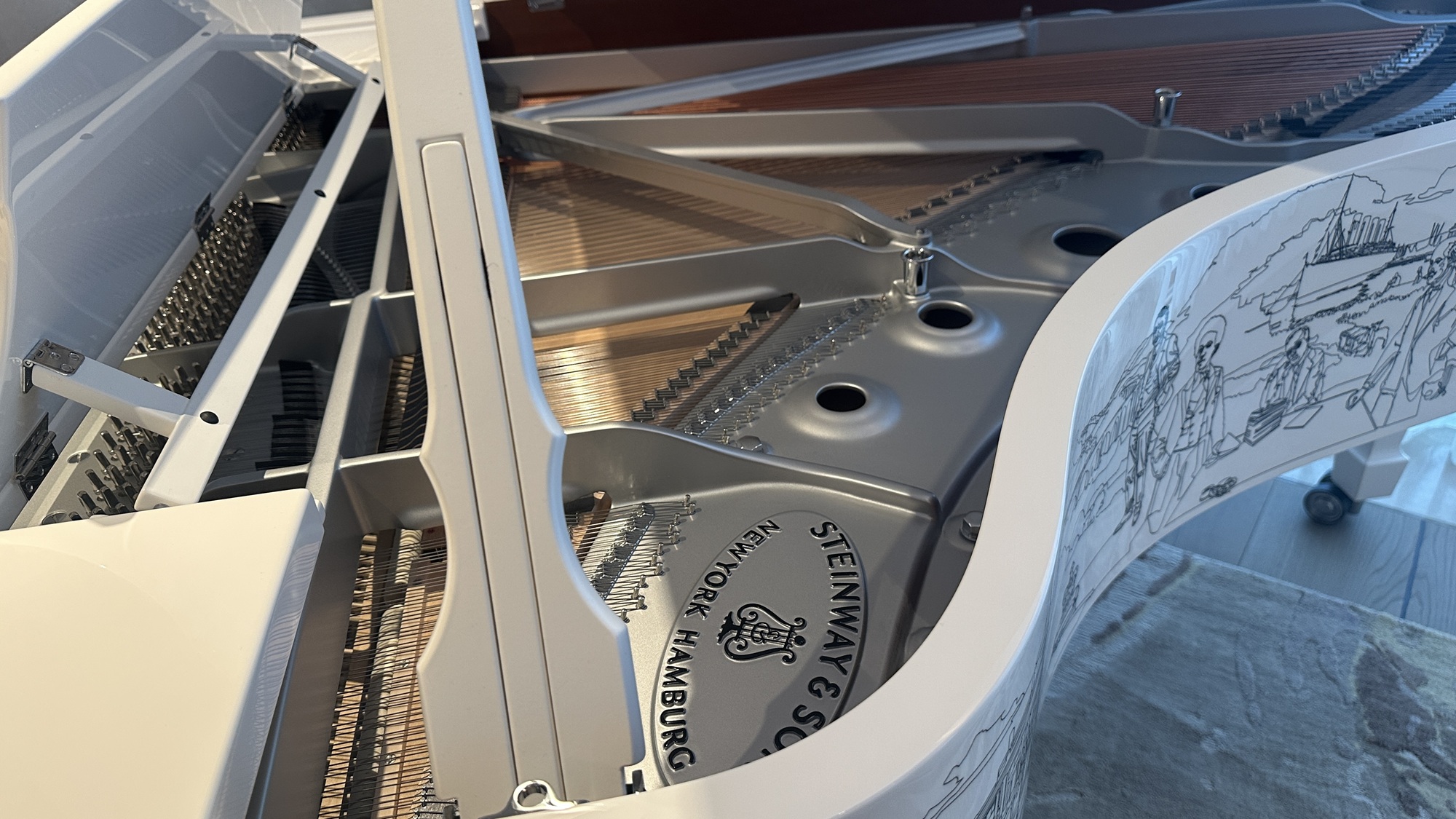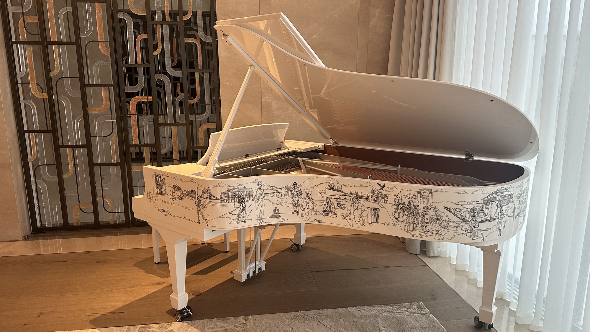 Το πιάνο, κοσμείται στο εξωτερικό του από ένα συνεχόμενο χειροποίητο σχέδιο του καλλιτέχνη Chris Moss το οποίο περιλαμβάνει συνολικά 67 εμβληματικά μοτίβα από τον Edward Elgar μέχρι τους The Beatles και τους Queen, δημιουργώντας ένα μοναδικό “οπτικό συμφωνικό έργο”.