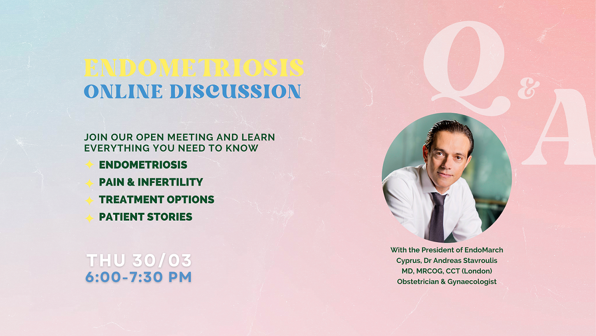 Η Εκστρατεία Endomarch, κορυφώνεται στις 30 Μαρτίου με την Ανοικτή Διαδικτυακή Εκδήλωση: “Let’s Talk About It”. Ο Πρόεδρος του Endomarch Cyprus Δρ. Ανδρέας Σταυρούλης Μαιευτήρας – Γυναικολόγος και Ιδρυτής του Endometriosis & Fertility Center Cyprus του American Medical Center, θα διαφωτίσει για τα αίτια και τις επιπλοκές της ενδομητρίωσης, καθώς και για τις θεραπευτικές επιλογές που έχουν οι γυναίκες, οι οποίες υποφέρουν από την πάθηση.