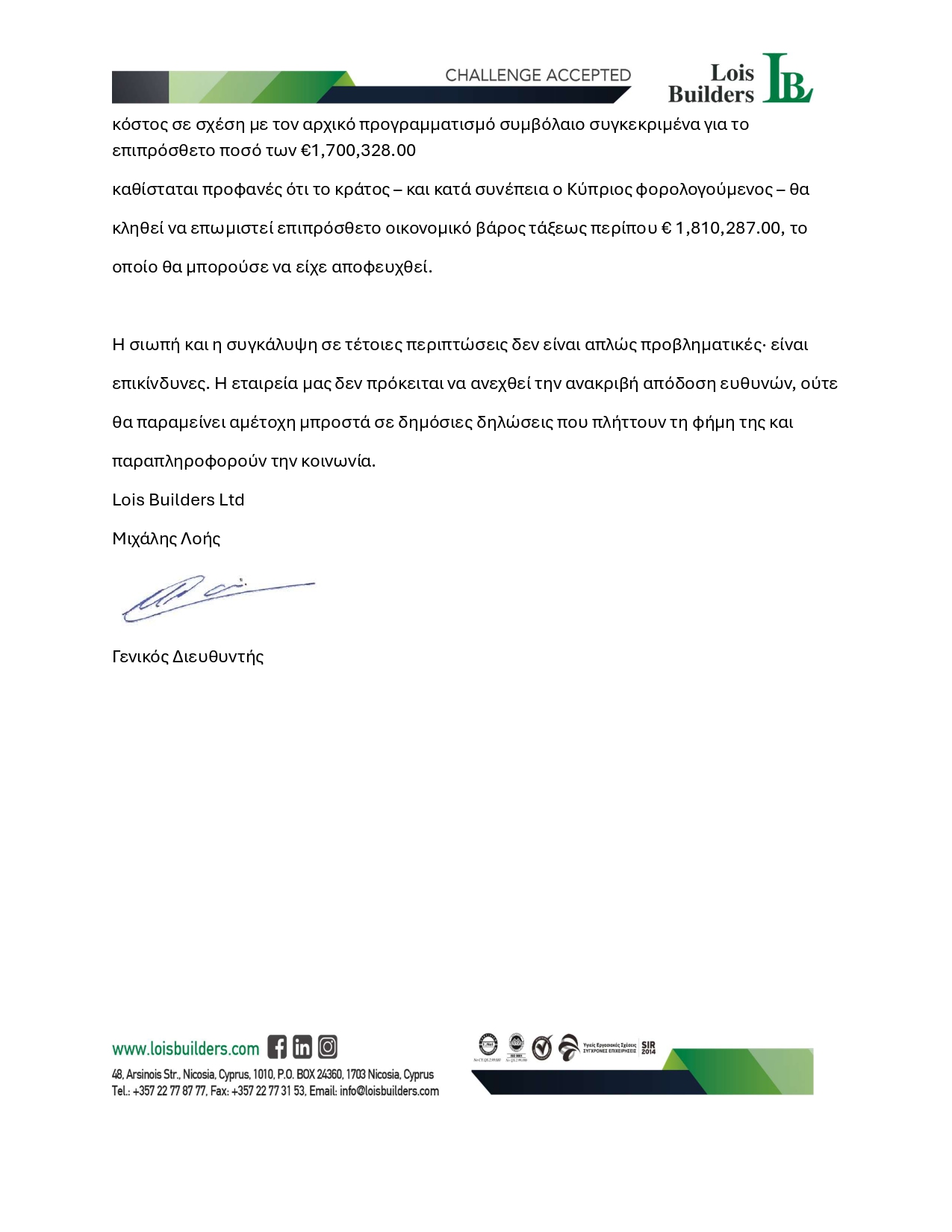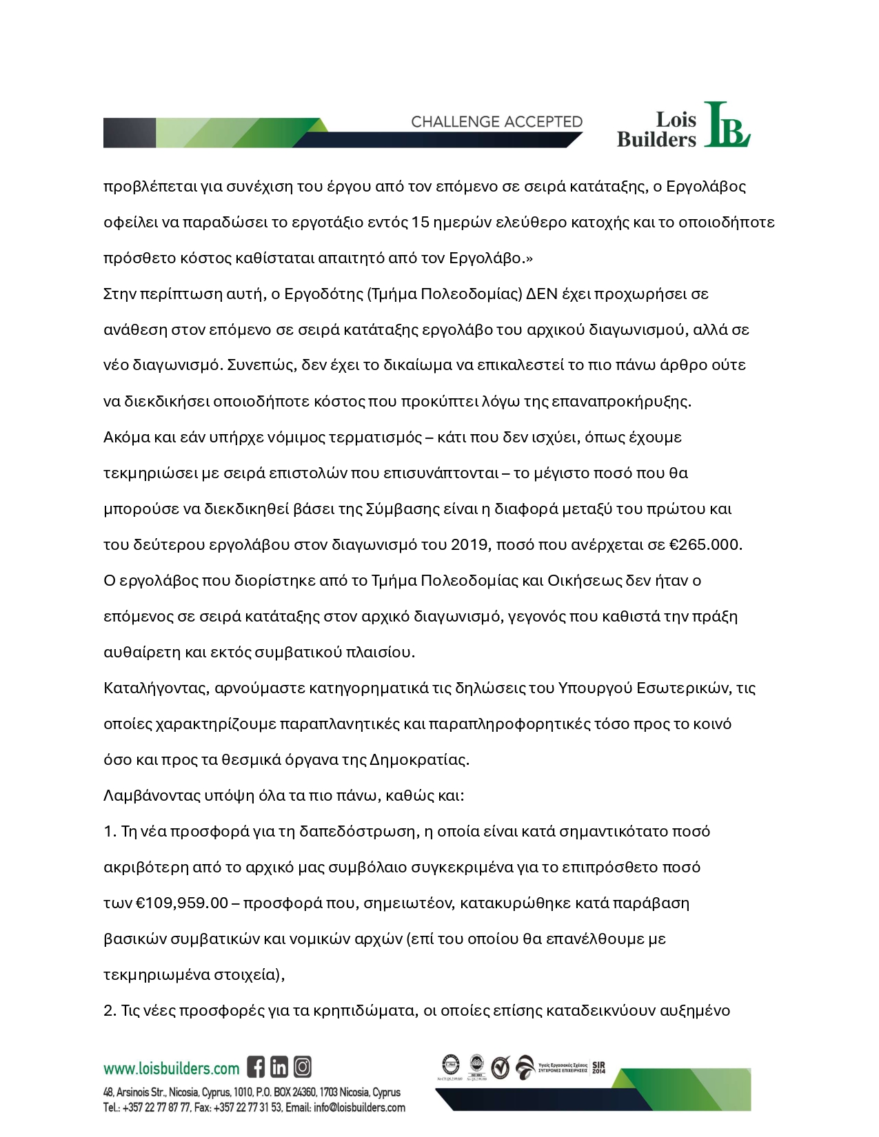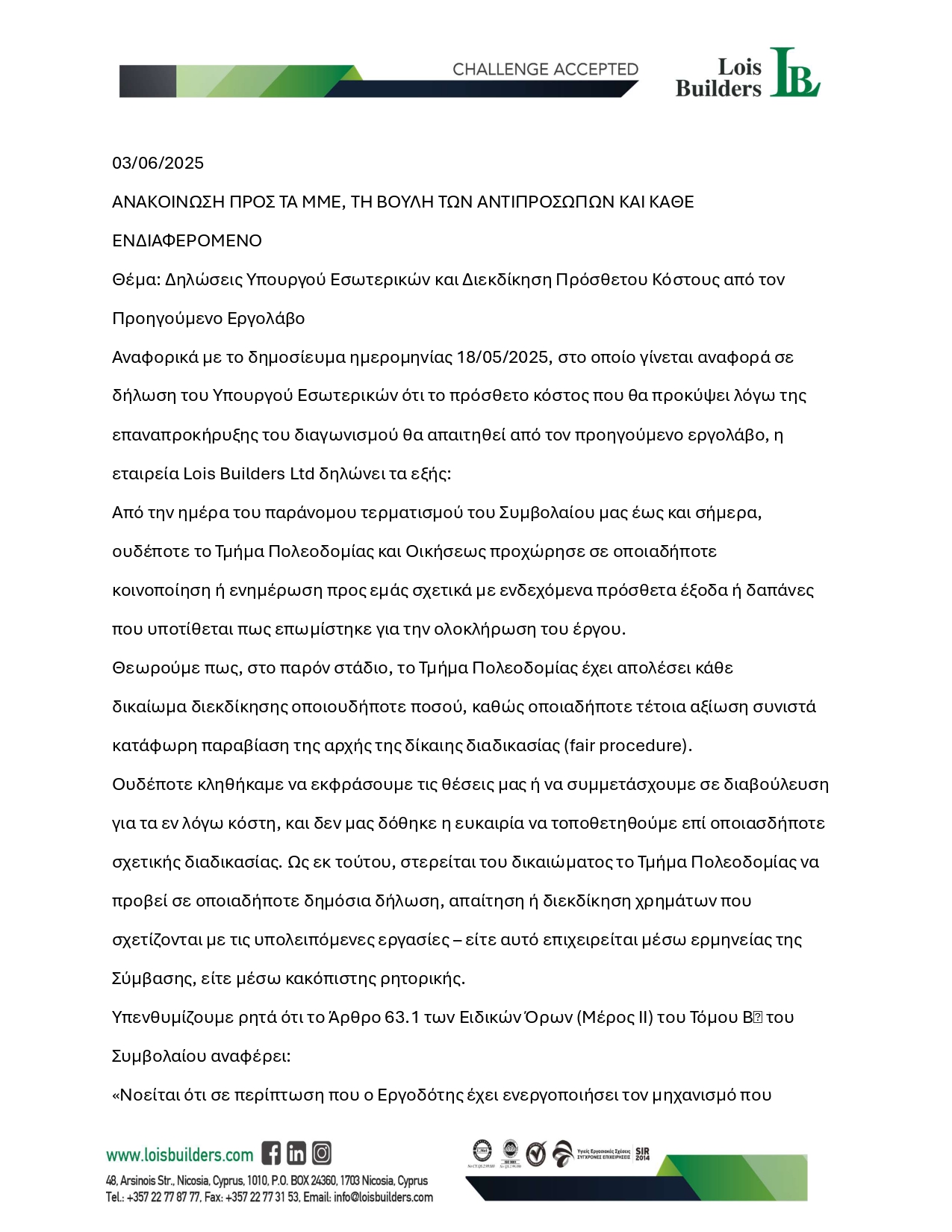 Mε ενυπόγραφη επιστολή προς τη Βουλή των Αντιπροσώπων, με αφορμή τη συζήτηση του θέματος ενώπιον της αρμόδιας Κοινοβουλευτικής Επιτροπής και δηλώσεις του Υπουργού Εσωτερικών Κωνσταντίνου Ιωάννου ότι το πρόσθετο κόστος που θα προκύψει λόγω της επαναπροκήρυξης του διαγωνισμού θα απαιτηθεί από τον προηγούμενο εργολάβο, η εταιρεία ξεκαθαρίζει ότι: