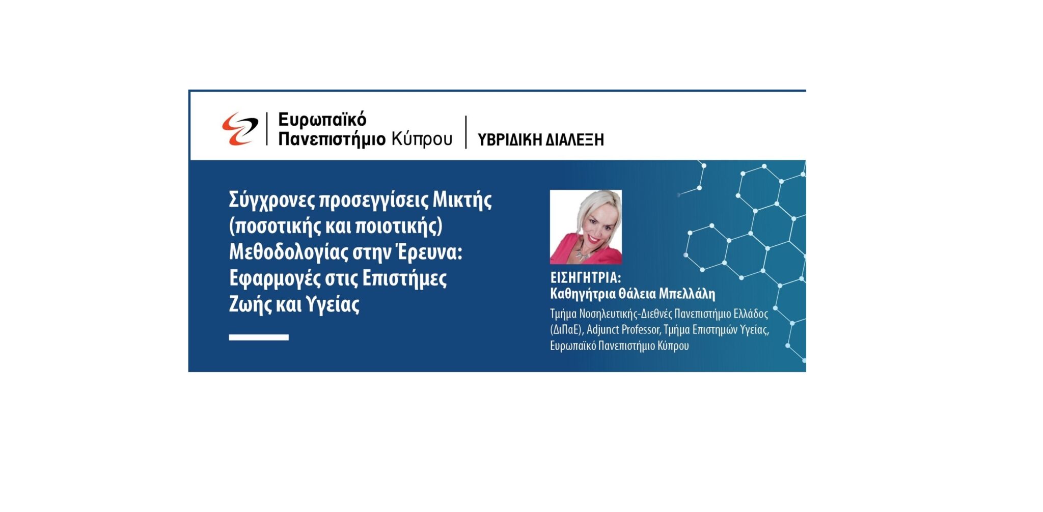 Το Τμήμα Επιστημών Υγείας, σας προσκαλεί σε Υβριδική Διάλεξη με θέμα τις Σύγχρονες προσεγγίσεις Μικτής (ποσοτικής και ποιοτικής) Μεθοδολογίας στην Έρευνα: Εφαρμογές στις Επιστήμες Ζωής και Υγείας, αυτή την Τρίτη, 28 Μαρτίου 2023, στην Αίθουσα 012 και διαδικτυακά.