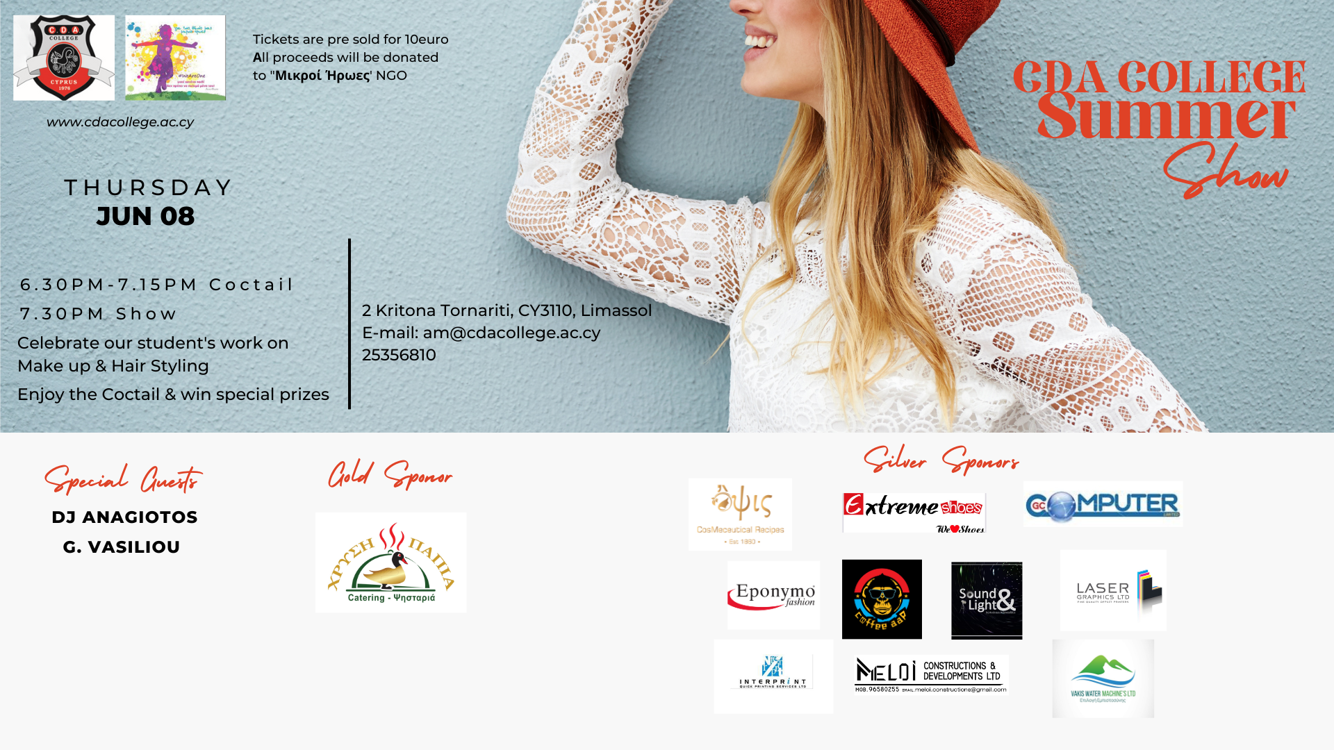 Φιλανθρωπικό Summer Show διοργανώνει το Κολέγιο CDA Παγκύπρια στις 8 Ιουνίου 2023 στις 6:30 το απόγευμα στις εγκαταστάσεις του Κολεγίου CDA Λεμεσού.