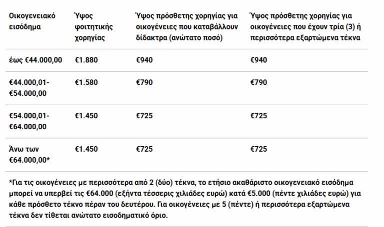 Όπως σημειώνεται, για οικογενειακό εισόδημα μέχρι €44.000, το ύψος της φοιτητικής χορηγίας ανέρχεται σε €1.880, με πρόσθετη χορηγία μέχρι €940 για οικογένειες που καταβάλλουν δίδακτρα και επιπλέον, €940 για οικογένειες που έχουν τρία ή περισσότερα εξαρτώμενα τέκνα.