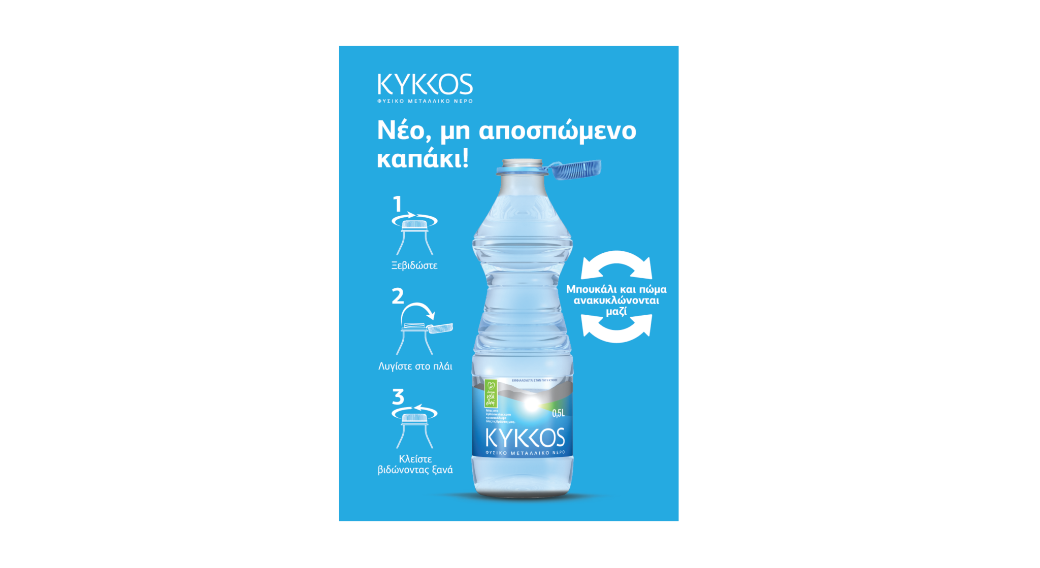Το μη αποσπώμενο καπάκι (Tethered Cap) συνοδεύει από τον περασμένο μήνα όλες τις συσκευασίες του Φυσικού Μεταλλικού Νερού Κύκκος. Μία σημαντική καινοτομία για το brand που ενισχύει τις προσπάθειες για μείωση της ποσότητας πλαστικού που καταλήγει σε χωματερές, θάλασσες και άλλα οικοσυστήματα, τα οποία έχουν αρνητικές επιπτώσεις στο περιβάλλον και κατ’ επέκταση τον άνθρωπο.