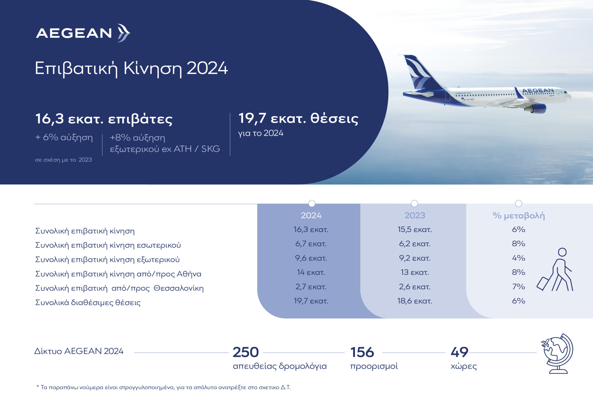 Η AEGEAN και η θυγατρική της Olympic Air μετέφεραν 12,5 εκατομμύρια επιβάτες το 2022. Το πρόγραμμα δρομολογίων το 2023 καλύπτει ένα δίκτυο 161 προορισμών (30 προορισμούς εσωτερικού και 131 εξωτερικού) σε 46 χώρες, με ένα στόλο 76 αεροσκαφών μεταξύ των οποίων τα ολοκαίνουργια Airbus A320 and A321 neo. Η AEGEAN είναι μέλος της μεγαλύτερης παγκόσμιας αεροπορικής συμμαχίας, της STAR ALLIANCE και βραβεύθηκε για 11η συνεχή χρονιά και 12η συνολικά τα τελευταία 13 χρόνια, ως η Καλύτερη Περιφερειακή Αεροπορική Εταιρεία στην Ευρώπη από τον οργανισμό των Skytrax World Airline Awards.
