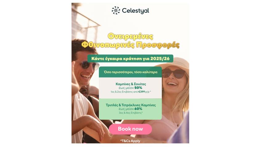 Η Celestyal έχει ανακοινώσει μια καμπάνια φθινοπωρινών προσφορών, η οποία είναι διαθέσιμη για νέες κρατήσεις που θα πραγματοποιηθούν έως τις 31 Οκτωβρίου 2024.