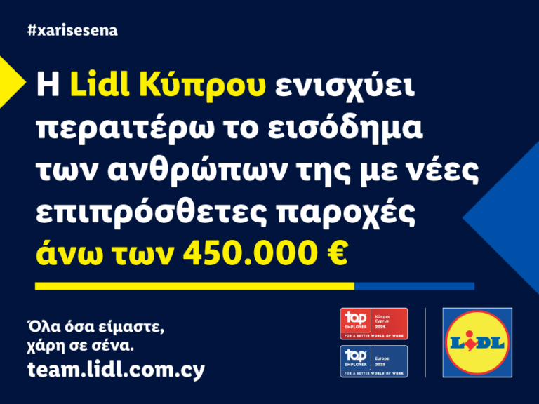 Η Lidl Κύπρου επιβραβεύει τη συλλογική προσπάθεια και συνεισφορά της ομάδας της, προχωρώντας στη χορήγηση επιπρόσθετων χρηματικών παροχών συνολικού ύψους 450.000€ με στόχο την ενίσχυση του εισοδήματός της. Παράλληλα, από την 1η Μαρτίου 2025 προχωράει στην καθιέρωση του κατώτατου μισθού για τους ανθρώπους της στα 1.220€ μεικτά.