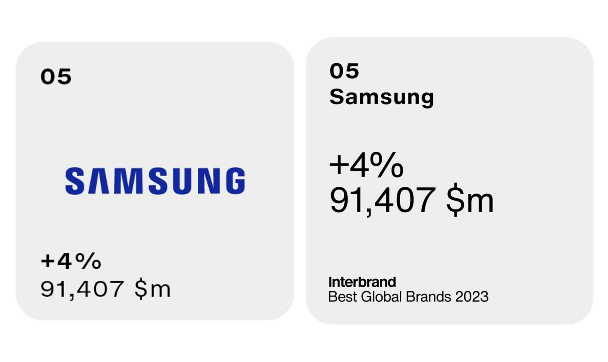Η Samsung Electronics Co., Ltd. αναγνωρίστηκε από την Interbrand, μια παγκόσμια συμβουλευτική εταιρεία για εμπορικές εταιρείες, ως ένα από τα «Global Top 5» εμπορικά σήματα, για τέταρτη συνεχή χρονιά. Η Interbrand δημοσιεύει κάθε χρόνο τη λίστα με τις «Καλύτερες Παγκόσμιες Εμπορικές Μάρκες». Στη φετινή λίστα, η αξία του εμπορικού σήματος της Samsung έφτασε στα 91,4 δισεκατομμύρια δολάρια και αυξήθηκε κατά 4% σε ετήσια βάση.