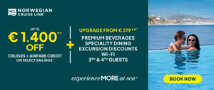 Οι ταξιδιώτες μπορούν να κάνουν κράτηση έως τις 4 Νοεμβρίου και να επωφεληθούν με έκπτωση έως €1.400 σε επιλεγμένες κρουαζιέρες, καθώς και να αναβαθμίσουν την εν πλω εμπειρία τους από μόλις €279 το άτομο, απολαμβάνοντας Premium Ποτά, Εξειδικευμένα Εστιατόρια, Εκπτώσεις σε Εκδρομές και Wi–Fi.