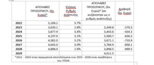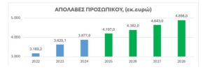 Σημειώνεται, επίσης, ότι οι εκτιμήσεις του Υπουργείου Οικονομικών έγιναν με απόδοση ΑΤΑ στο 67%, όχι στο 80% που ισχύει σήμερα, ούτε στο 100% που θα εφαρμοστεί από το 2027. Συνεπώς οι προβλέψεις αυτές δύναται να αναθεωρηθούν προς τα πάνω και η αύξηση στο κόστος του κρατικού μισθολογίου να είναι ακόμα μεγαλύτερη. Με βάση τη δική μας εκτίμηση το κρατικό μισθολόγιο θα ξεπεράσει τα 5 δις ευρώ το 2028.