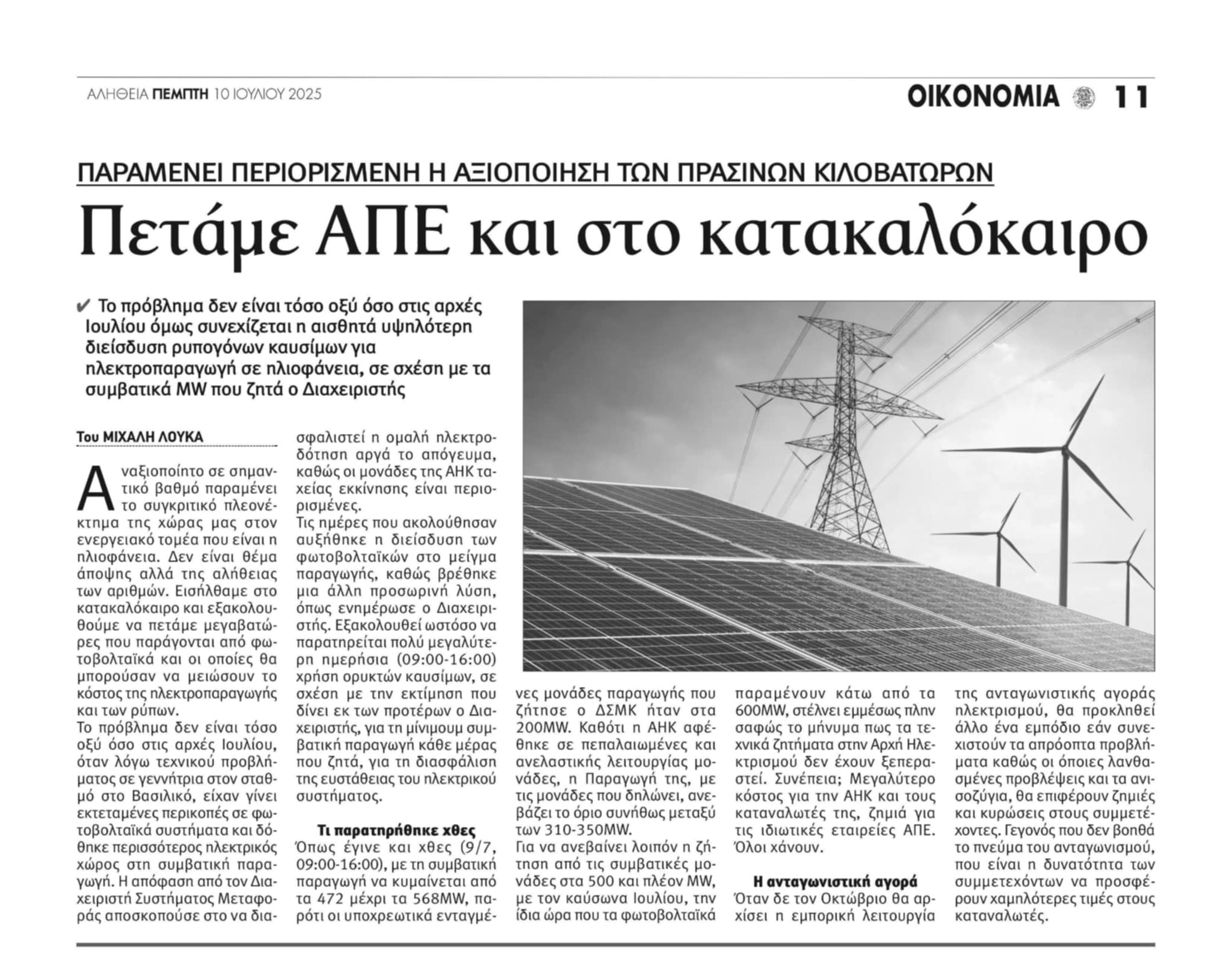 Στο δημοσίευμα τονίζεται ότι το πρόβλημα δεν είναι τόσο οξύ όσο στις αρχές Ιουλίου, όταν λόγω τεχνικού προβλήματος σε γεννήτρια στον σταθμό στο Βασιλικό, είχαν γίνει εκτεταμένες περικοπές σε φωτοβολταϊκά συστήματα και δόθηκε περισσότερος ηλεκτρικός χώρος στη συμβατική παραγωγή. Η απόφαση από τον Διαχειριστή Συστήματος Μεταφοράς αποσκοπούσε στο να διασφαλιστεί η ομαλή ηλεκτροδότηση αργά το απόγευμα, καθώς οι μονάδες της ΑΗΚ ταχείας εκκίνησης είναι περιορισμένες.