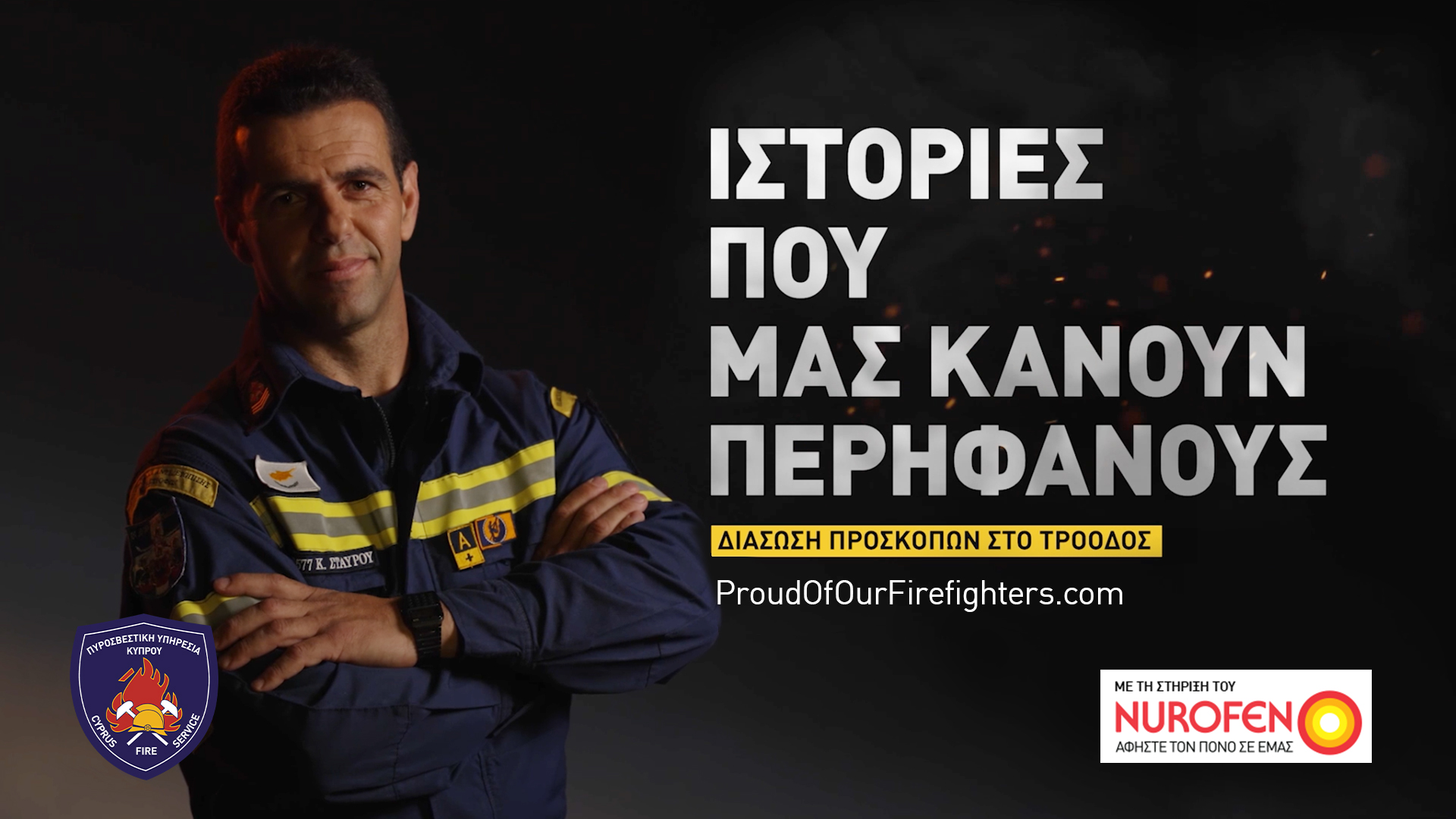 Στα πλαίσια της κοινωνικής ευαισθησίας και υπευθυνότητάς του, το brand Nurofen συνεχίζει την στρατηγική συνεργασία του με την Πυροσβεστική Υπηρεσία Κύπρου. Το brand, θέλοντας να στηρίξει τους Πυροσβέστες της Κύπρου και να τιμήσει το ηρωικό έργο τους, μεταφέρει στο κοινό 5 ιστορίες δράσης Πυροσβεστών, σε βίντεο τα οποία θα φιλοξενούνται στο Youtube της Πυροσβεστικής Υπηρεσίας Κύπρου και στην ειδική ιστοσελίδα που έχει ετοιμαστεί για την εκστρατεία www.proudofourfirefighters.com