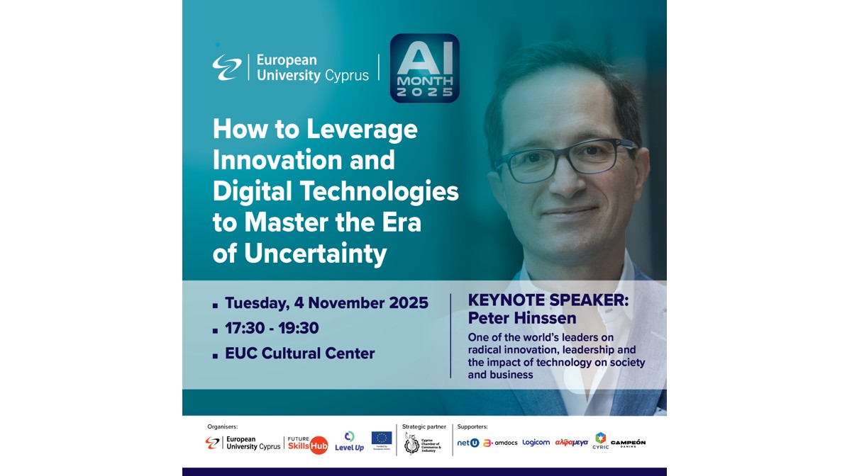 Το Ευρωπαϊκό Πανεπιστήμιο Κύπρου (EUC) φέρνει στη Λευκωσία έναν από τους πιο επιδραστικούς παγκόσμιους στοχαστές στον τομέα της καινοτομίας, της ηγεσίας και της τεχνολογίας. Ο Peter Hinssen, διεθνώς αναγνωρισμένος ομιλητής, συγγραφέας και σύμβουλος εταιρειών όπως Google, Amazon, Microsoft και Apple, θα πραγματοποιήσει αποκλειστική ομιλία με τίτλο: