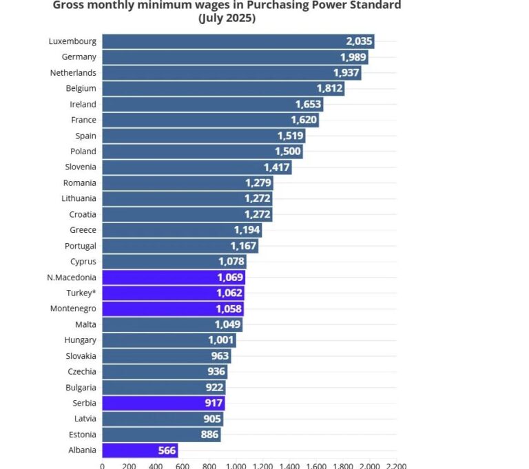 Σύμφωνα με την Eurostat, τον Ιούλιο του 2025, ο μηνιαίος κατώτατος μισθός πριν από τις κρατήσεις στην ΕΕ κυμαινόταν από 551 ευρώ στη Βουλγαρία έως 2.704 ευρώ στο Λουξεμβούργο.