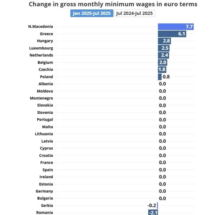 Κατά τους τελευταίους έξι μήνες, από τον Ιανουάριο έως τον Ιούλιο του 2025, ο κατώτατος μισθός παρέμεινε αμετάβλητος στις περισσότερες χώρες της ΕΕ και στις υποψήφιες χώρες. Σε ευρώ, η Βόρεια Μακεδονία κατέγραψε την υψηλότερη αύξηση με 7,7%, ακολουθούμενη από την Ελλάδα με 6,1%. Η Τουρκία σημείωσε τη μεγαλύτερη πτώση, με μείωση 21,2%, ακολουθούμενη από την Ουκρανία με πτώση 9,9%.