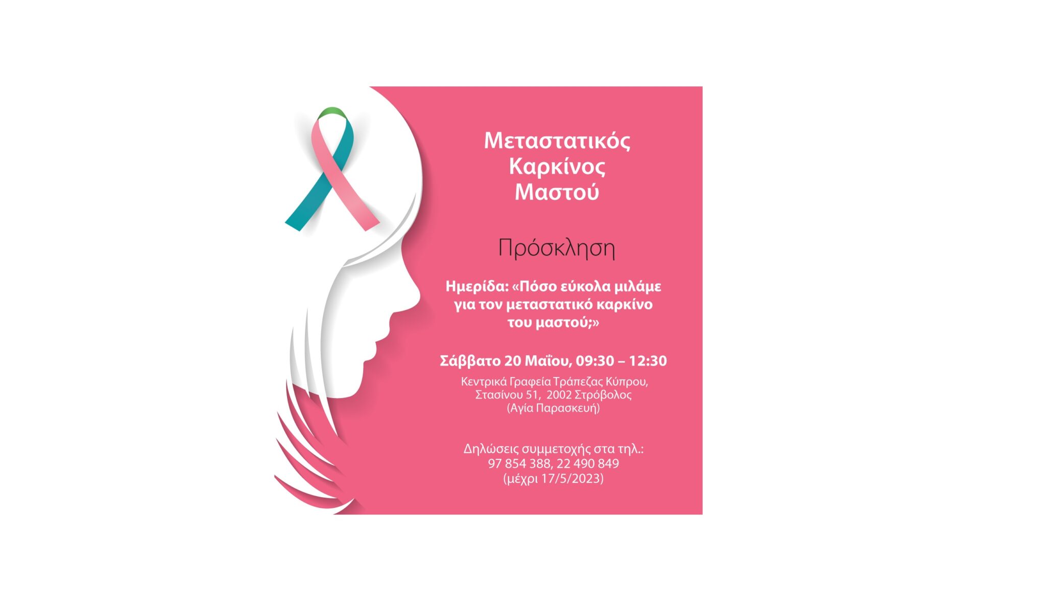 Το Ογκολογικό Κέντρο Τράπεζας Κύπρου και η Europa Donna Κύπρου, συνδιοργανώνουν την Ενημερωτική Ημερίδα «Πόσο εύκολα μιλάμε για τον Μεταστατικό Καρκίνου του Μαστού;». Η Ημερίδα, η οποία είναι ανοικτή για το κοινό, θα πραγματοποιηθεί το Σάββατο 20 Μαΐου 2023, μεταξύ των ωρών 09:30-12:30, στα Κεντρικά Γραφεία Τράπεζας Κύπρου, στον Στρόβολο (Αγία Παρασκευή).