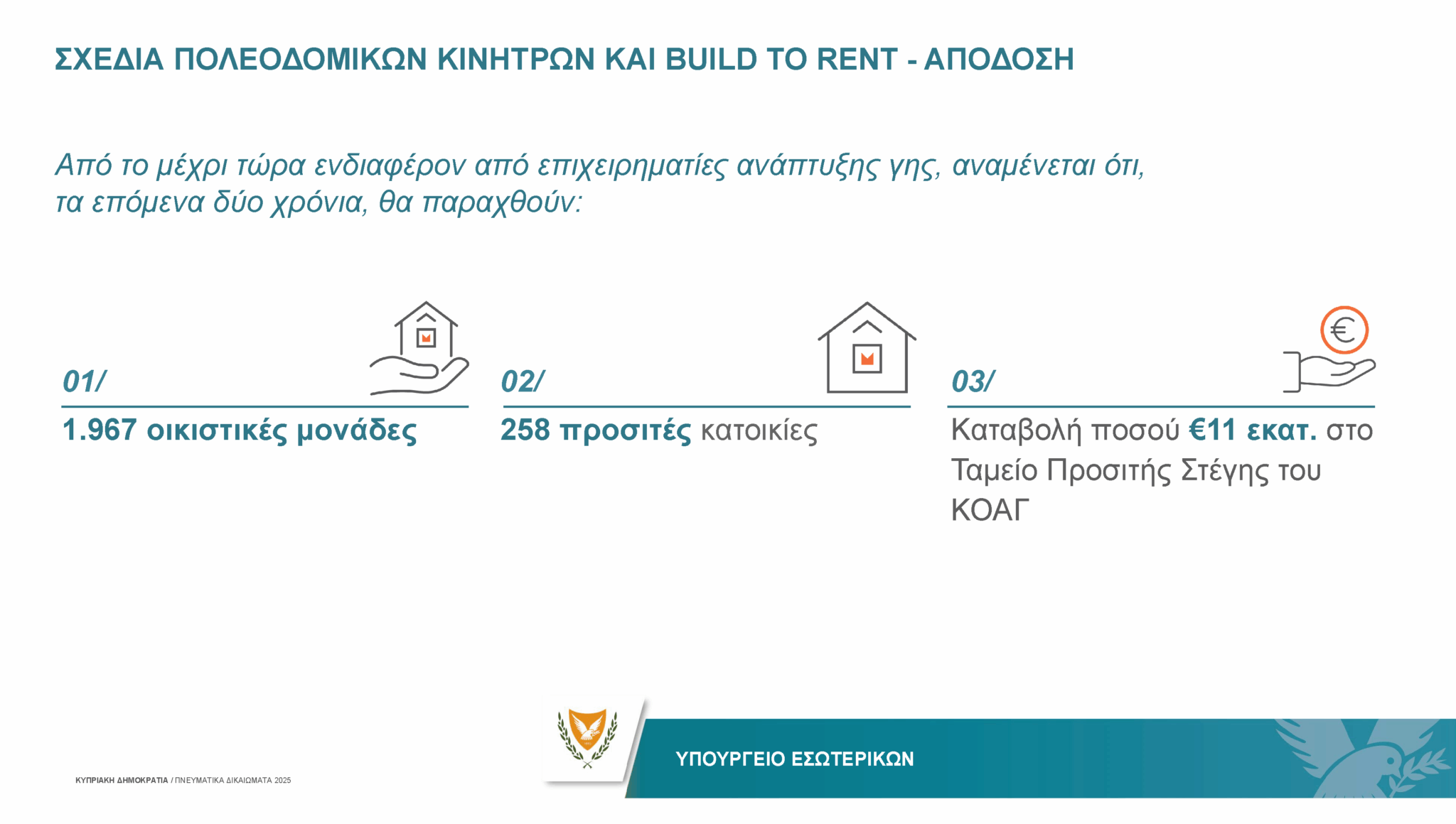 Το βασικό εργαλείο παραμένει το σχέδιο Build to Rent, που δίνει αυξημένο συντελεστή δόμησης έως 45% σε ιδιώτες, με αντάλλαγμα την κατασκευή προσιτών κατοικιών. Αναμένεται να παραχθούν σχεδόν 2.000 μονάδες, με 258 προσιτές κατοικίες και €11 εκατ. προς το Ταμείο Προσιτής Στέγης. Το σχέδιο έχει ήδη βελτιωθεί δύο φορές και θεωρείται ότι λειτουργεί αποτελεσματικά.