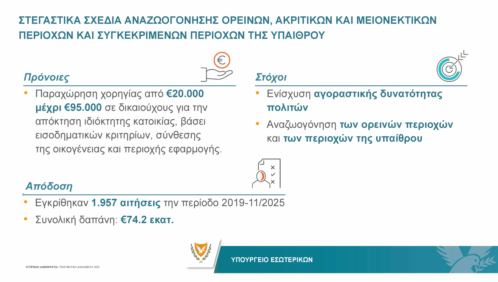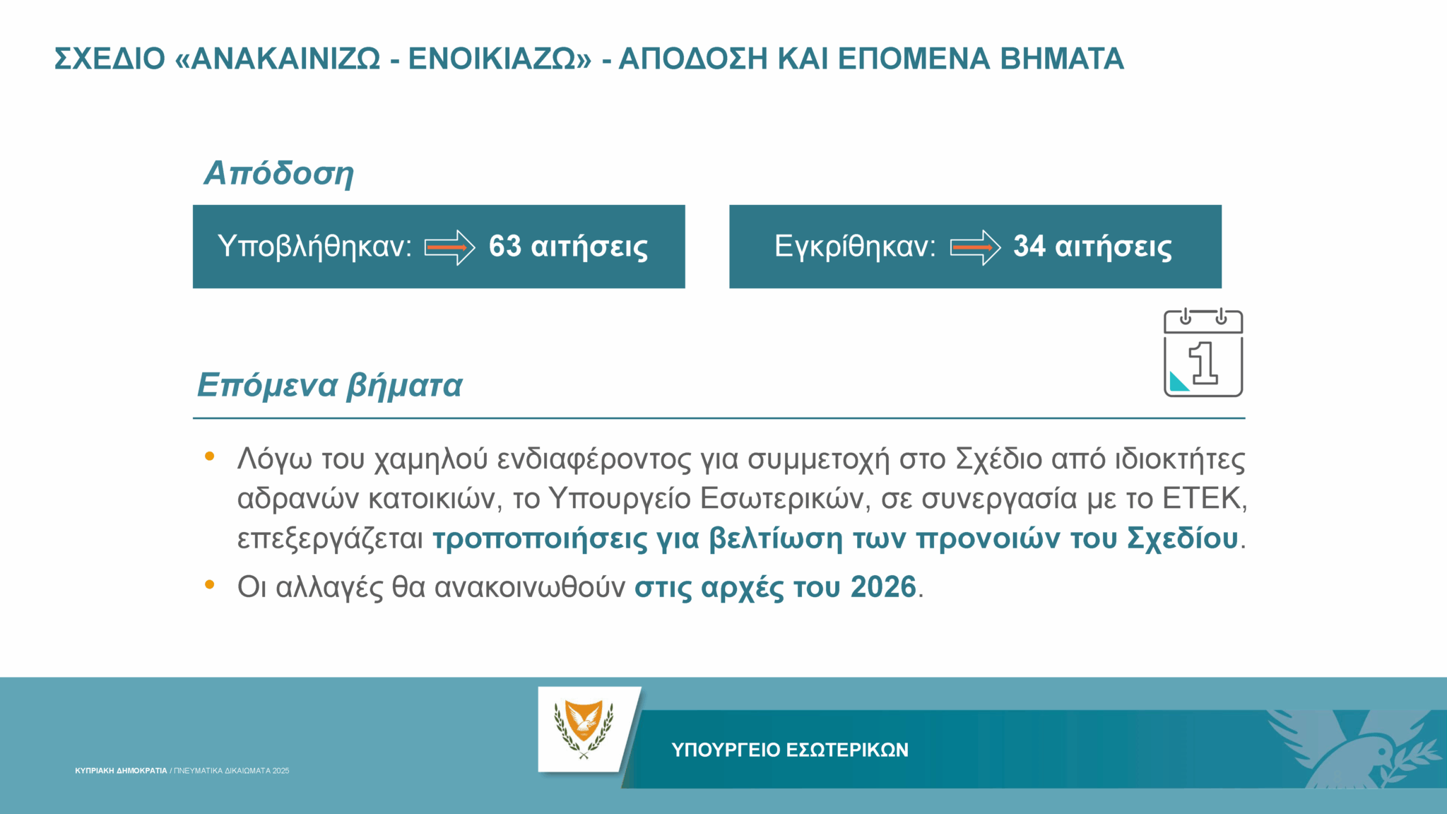 Το σχέδιο επιδότησης για ανακαίνιση κενών κατοικιών (15–35 χιλ. ευρώ) είχε μικρή ανταπόκριση. Όπως εξήγησε ο Υπουργός, το πρόβλημα δεν είναι το ύψος της χορηγίας αλλά η έλλειψη συνεργείων, τα κληρονομικά θέματα και η απροθυμία ιδιοκτητών να εμπλακούν σε διαδικασίες. Στις αρχές του 2026 θα ανακοινωθούν αλλαγές, πιθανότατα με αύξηση ποσών και περαιτέρω απλοποιήσεις.