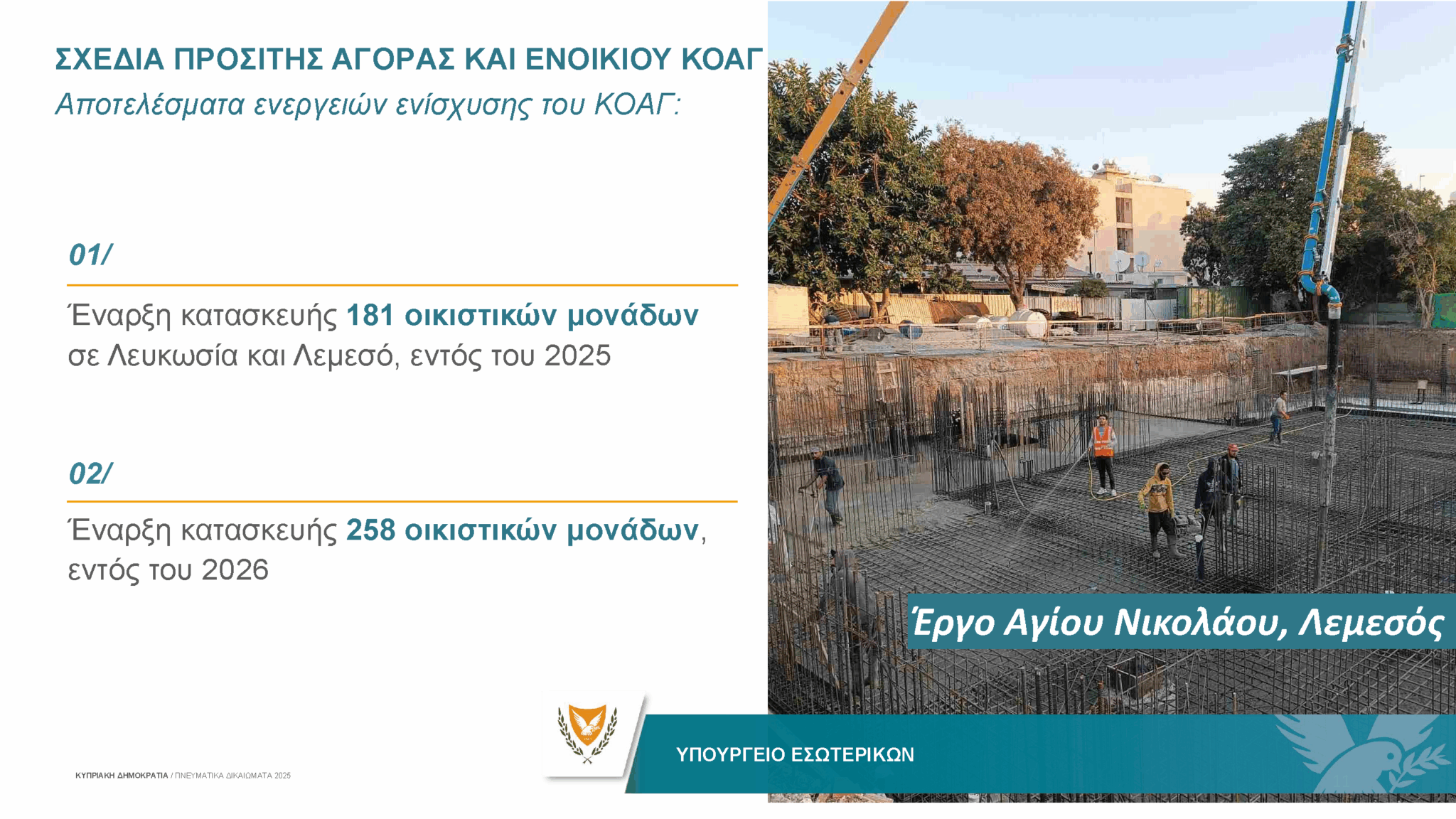Ανακοινώθηκαν 500 προσιτές κατοικίες σε κρατική γη, οι οποίες θα διαχειρίζονται με συμβόλαια και κανόνες όπως στην ιδιωτική αγορά, με τον ΚΟΑΓ να αναλαμβάνει τη διαχείριση. Παράλληλα, ο νέος σχεδιασμός για συλλογική διαμονή εργαζομένων αναμένεται να αποσυμφορήσει την αγορά και να εξαφανίσει ακατάλληλες συνθήκες διαβίωσης.
