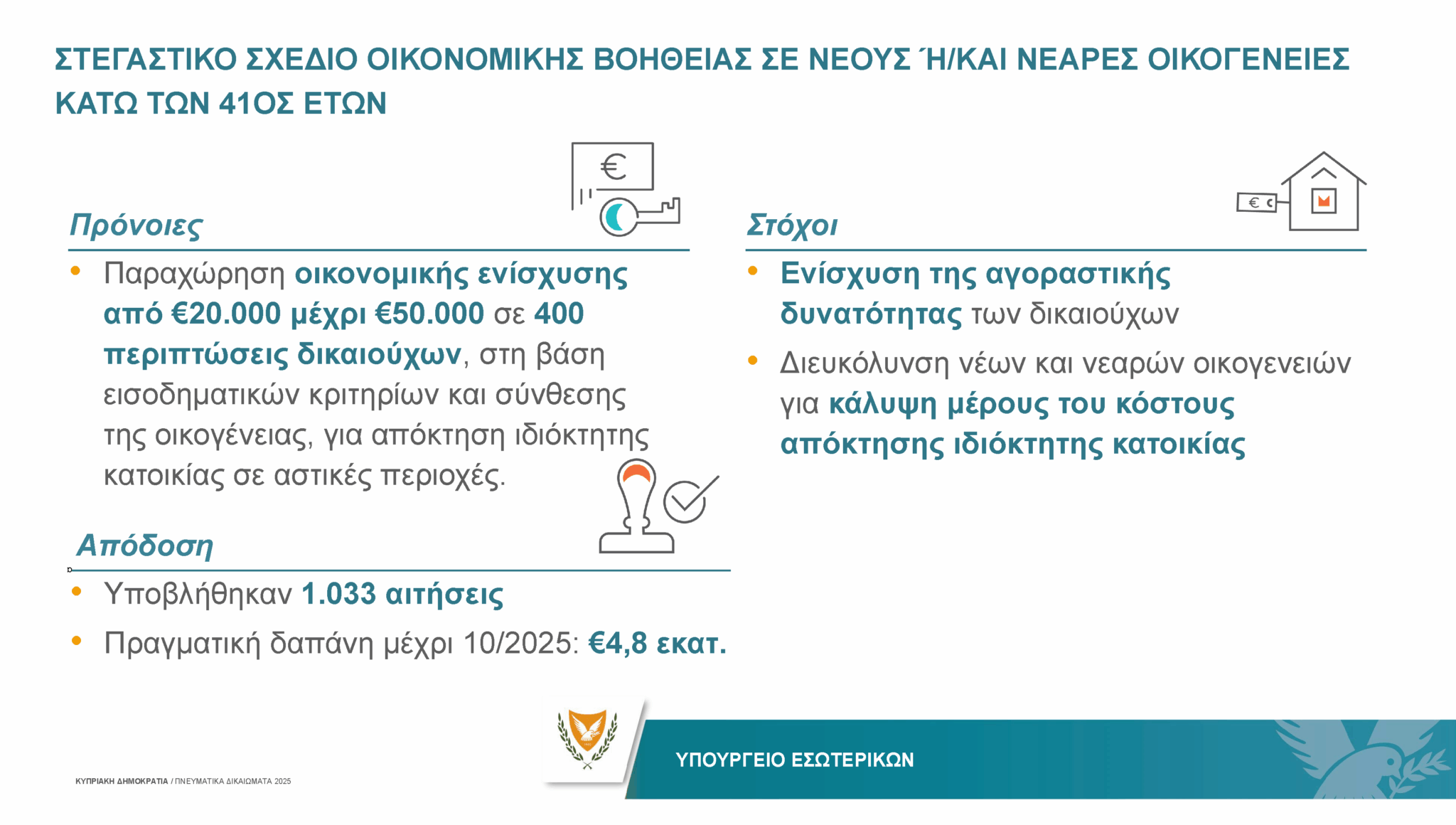 Εξίσου υψηλή ζήτηση καταγράφει το στεγαστικό σχέδιο για νέους μέχρι 41 ετών, με 1.033 αιτήσεις και ήδη 300 εγκρίσεις. Η κυβέρνηση εξετάζει αύξηση διαθέσιμων κονδυλίων.