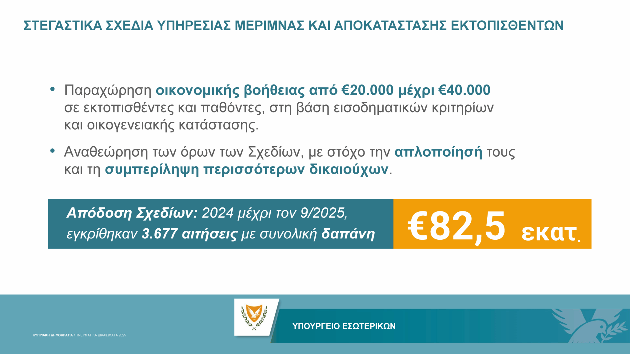 Ο κ. Ιωάννου σημείωσε ότι τα σχέδια για αποκατάσταση προσφύγων έχουν αναθεωρηθεί πλήρως, με αύξηση εισοδηματικών κριτηρίων και μετρήσιμα κριτήρια κατανομής. Το ποσό που δόθηκε σε πρόσφυγες το 2024–2025 ξεπερνά τα €80 εκατ. Παράλληλα, στα τουρκοκυπριακά ακίνητα εφαρμόζονται πλέον διαφανή και αντικειμενικά κριτήρια κατανομής, με αυξημένα έσοδα για συντήρηση και ανακαίνιση.