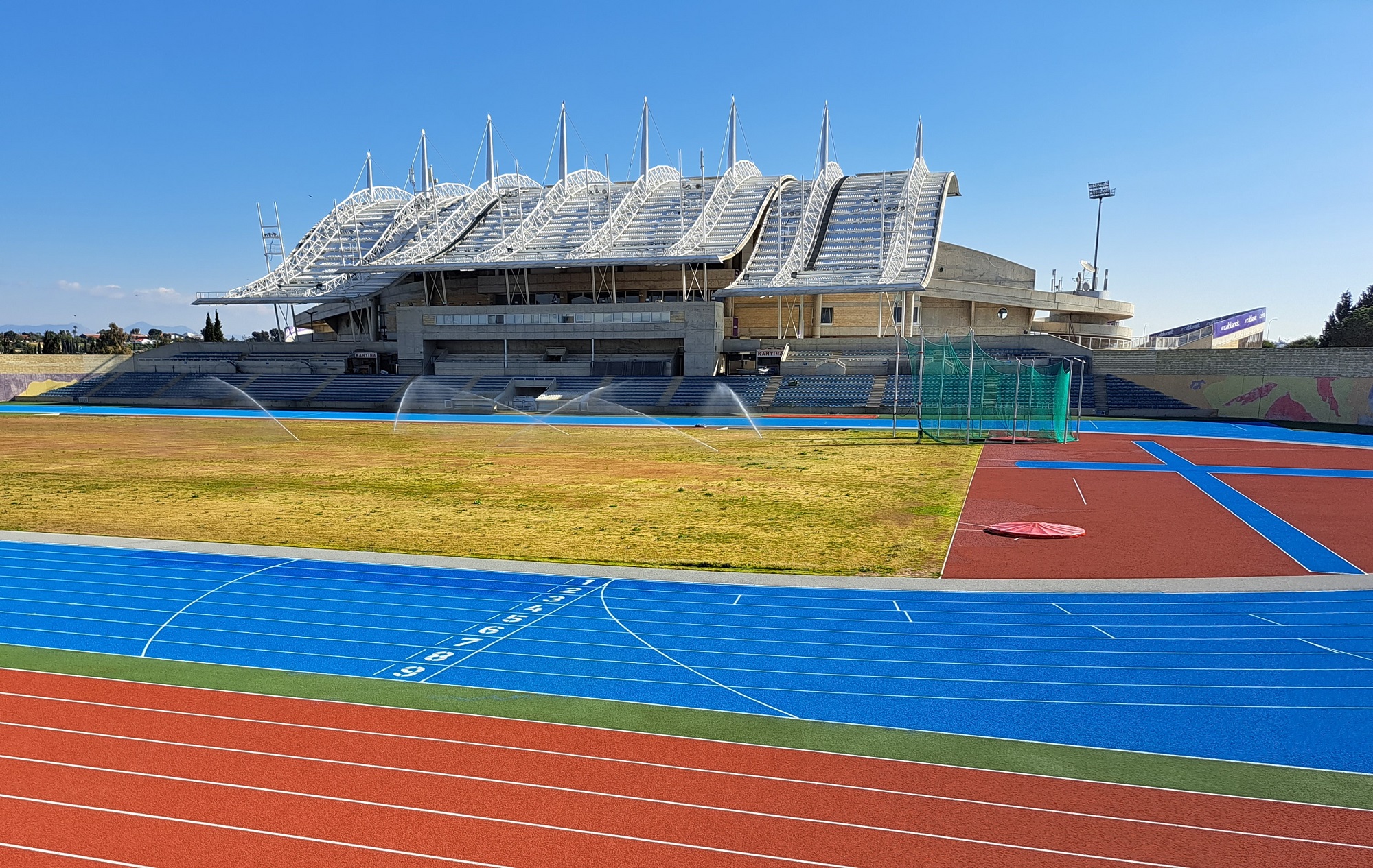 Στο Εθνικό Στάδιο Στίβου ΓΣΠ έχει τοποθετηθεί μοντέρνος μπλε τάπητας και έγινε η γραμμογράφησή του από Γερμανό ειδικό. Κάτω από το νέο ταρτάν του Εθνικού Σταδίου, στην ευθεία των 110 μέτρων, υπάρχουν τρεις διάδρομοι με υποδαπέδια ηλεκτρονική χρονομέτρηση, όπως και σε δύο διαδρόμους των 400μ. Παρόμοιος μηχανισμός υπάρχει και στον διάδρομο των οριζόντιων, απ’ όπου οι προπονητές μπορούν να μετρούν την ταχύτητα των αθλητών, κάτι που είναι αρκετά σημαντικό στις προπονήσεις. Στο Στάδιο υπάρχουν τέσσερα σκάμματα για τα οριζόντια άλματα, δύο χώροι για τη διεξαγωγή του ύψους, θέση για το επί κοντώ, με προδιαγραφή σε δύο από τα σκάμματα των οριζόντιων αλμάτων να τοποθετηθεί η βαλβίδα υποδοχής κονταριού και στρώματα για το επί κοντώ, υπάρχουν δύο μεγάλες βαλβίδες και κλωβοί για τη δισκοβολία και τη σφυροβολία, τέσσερις θέσεις για τη σφαιροβολία, δύο διάδρομοι για τον ακοντισμό και δύο διάδρομοι των 110 μέτρων.