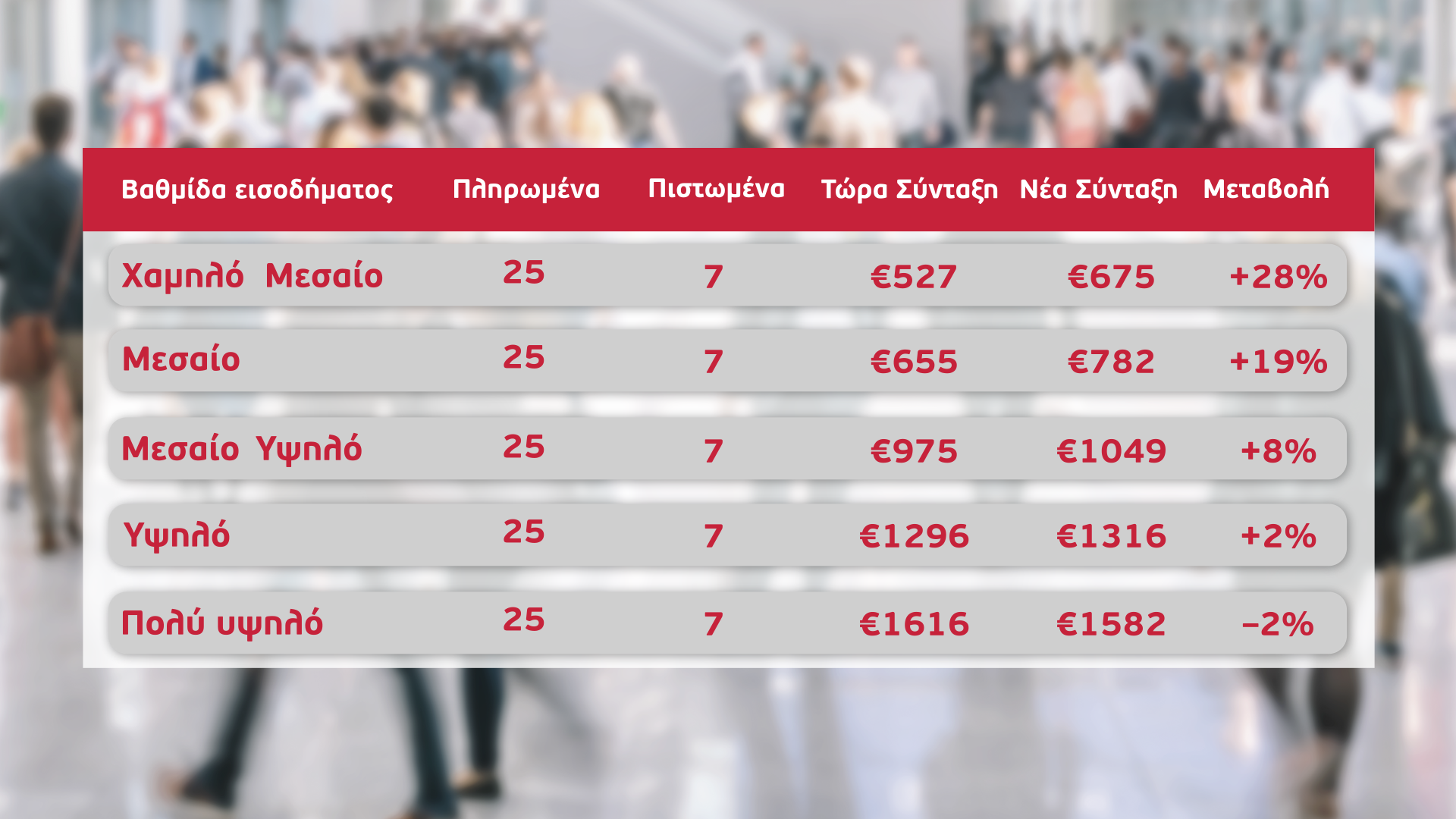 Για τον υψηλά αμειβόμενο, η σύνταξη είναι στα 1296 και πάει στα 1316 και για τον πολύ υψηλά τώρα είναι 1616 και θα πάει στα 1582.