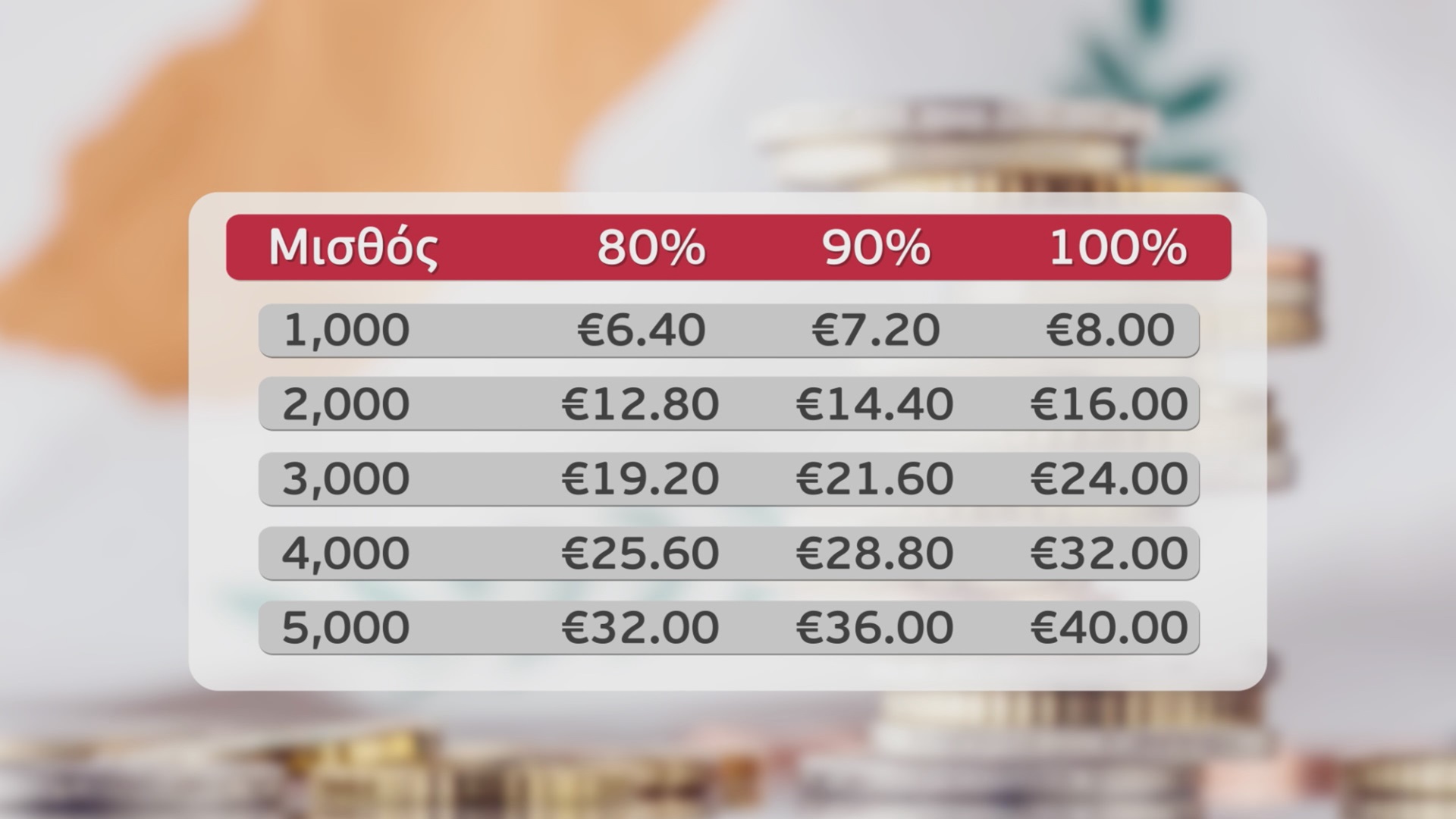Για τον εργαζόμενο που παίρνει 1,000 ευρώ, με την αύξηση του ποσοστού στο 80%, θα παίρνει επιπλέον κάθε μήνα 6,40. Όταν το ποσοστό φτάσει το 90%, θα παίρνει 7,20 και όταν πάει στο 100%, 8 ευρώ.