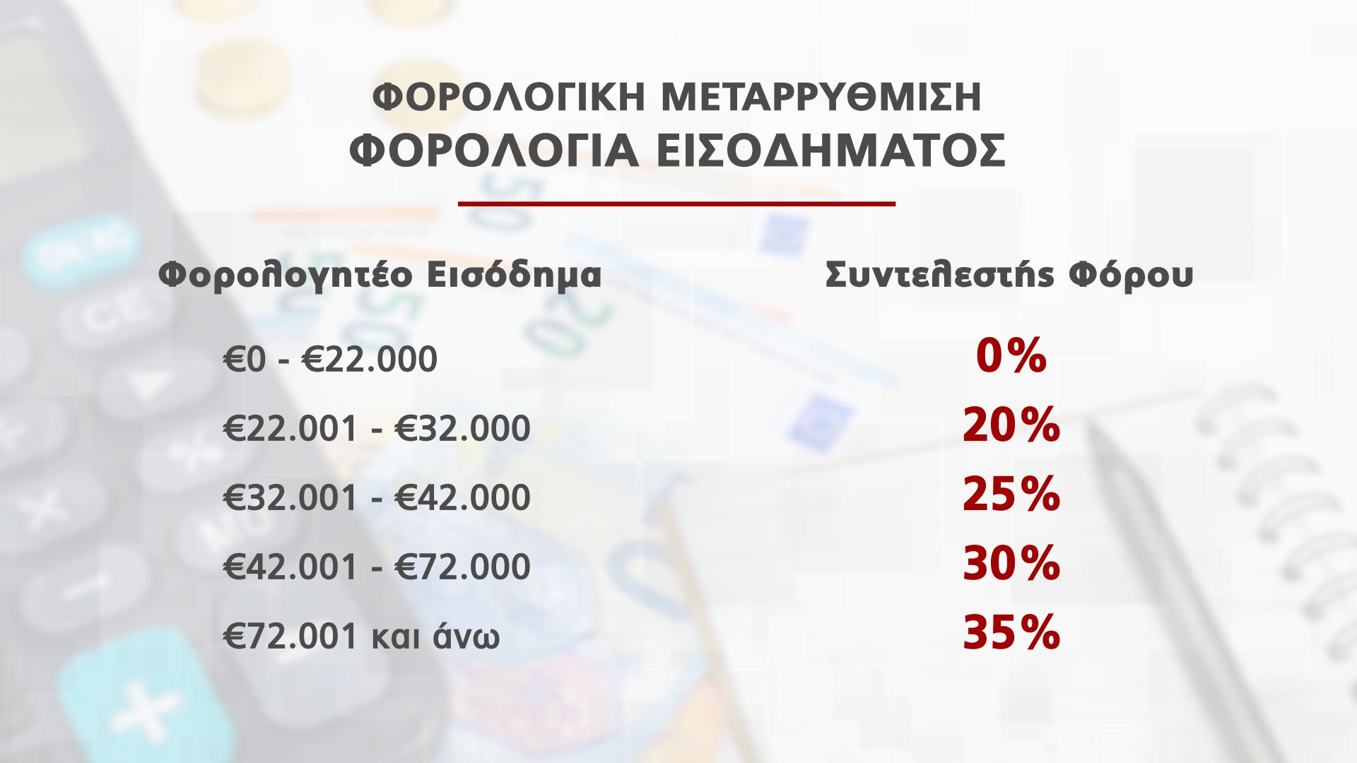 Υπενθυμίζεται ότι μετά την φορολογική μεταρρύθμιση φορολογία του εισοδήματος καθορίζεται ως εξής: