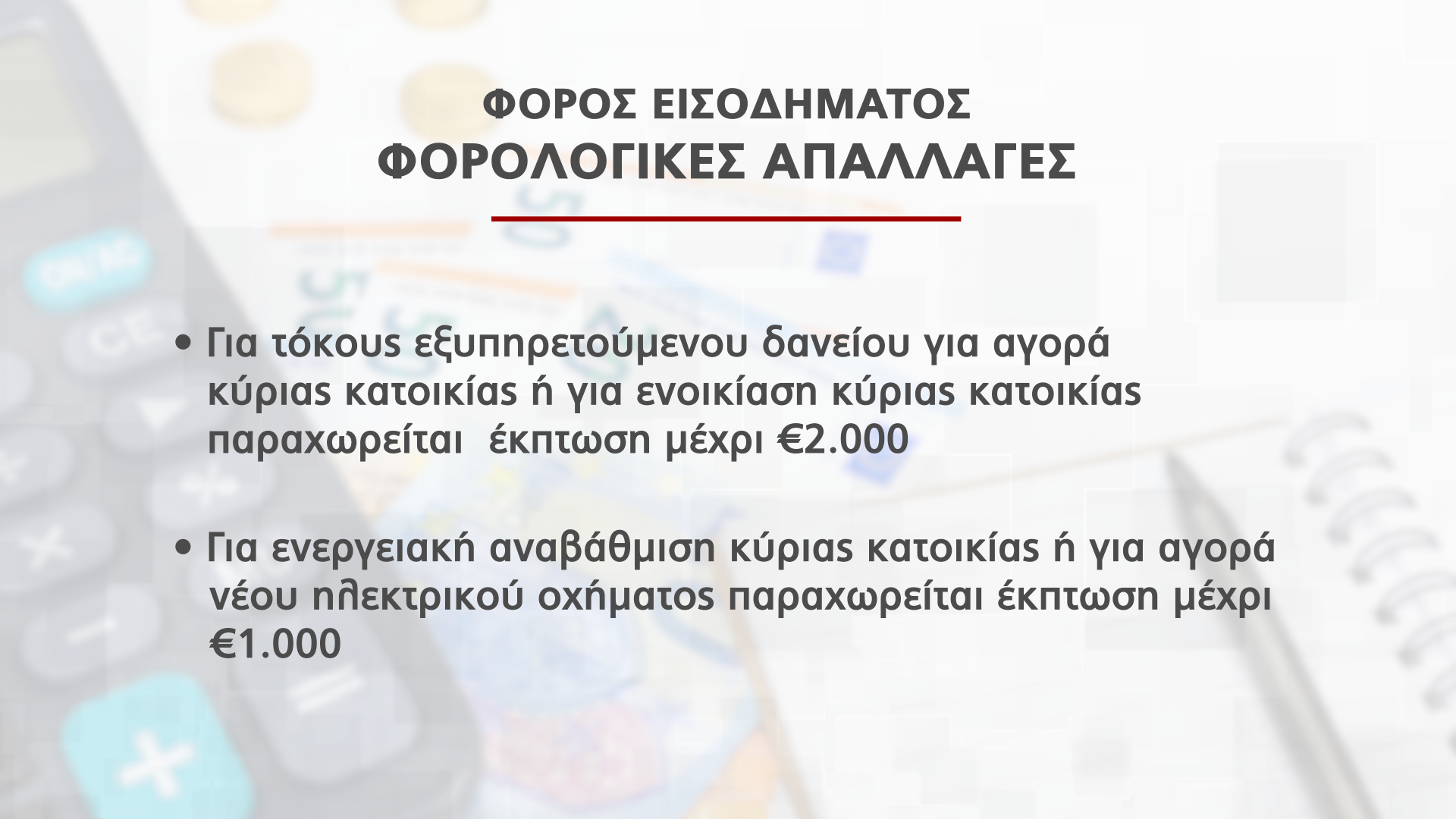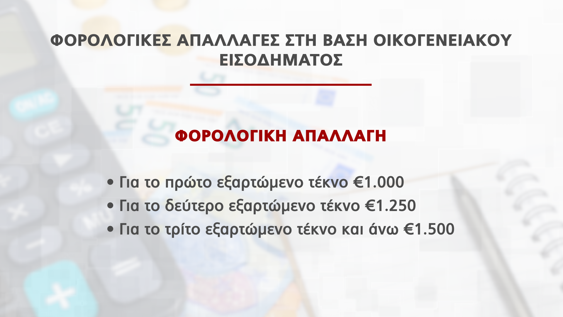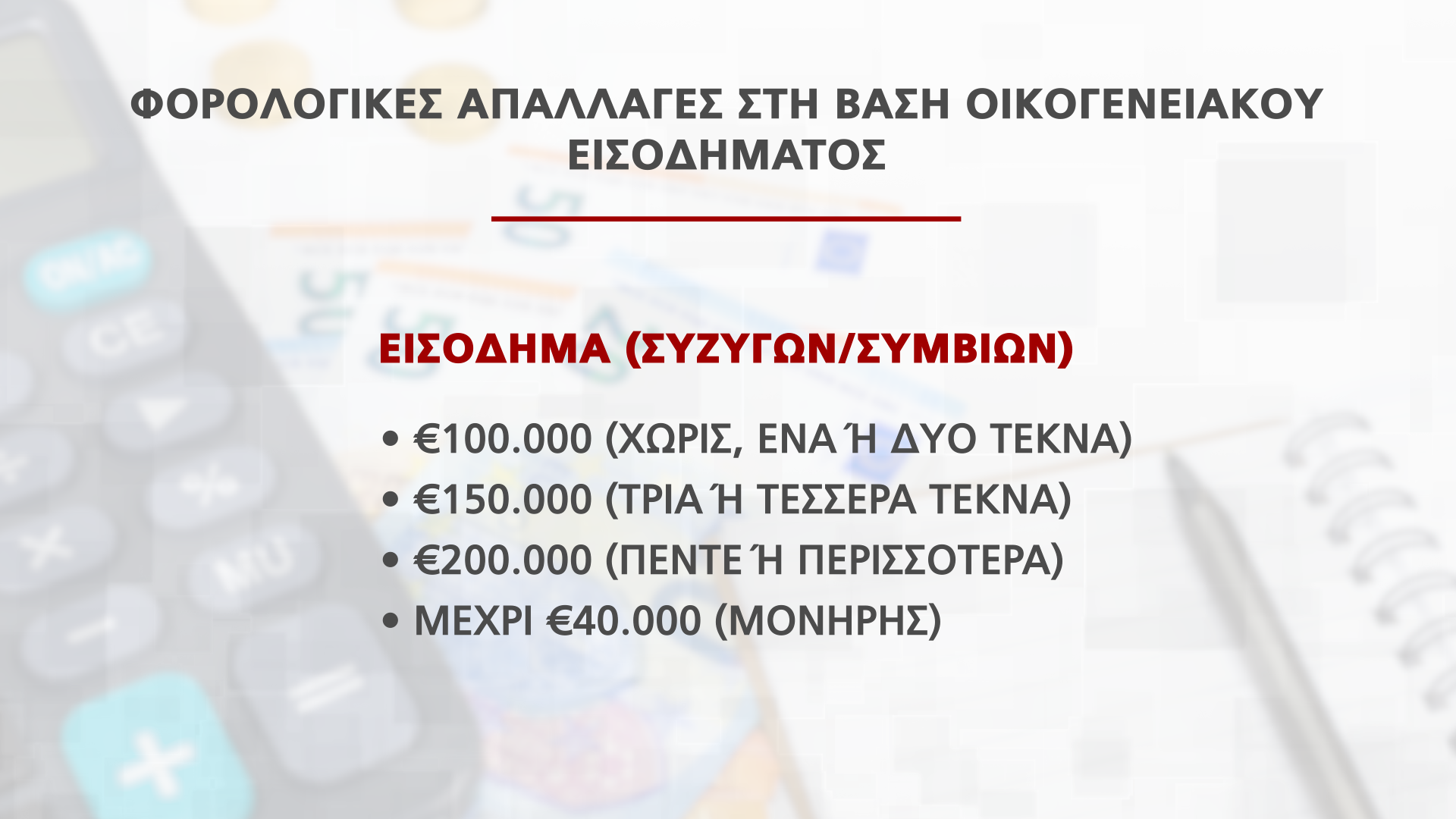 Ενώ οι φορολογικές απαλλαγές στη βάση οικογενειακού εισοδήματος καθορίζονται ως εξής: