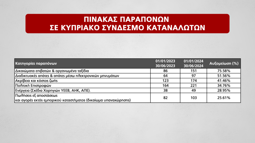 «Κάποιες εκ των εταιρειών αυτές προχώρησαν σε καθυστέρηση στο να αποζημιώσουν τους καταναλωτές, καθυστέρηση η οποία υπερβαίνει τους έξι με επτά μήνες. Είχαμε περίπτωση παραπονούμενης που θα ταξίδευε από Κύπρο με προορισμό τις Βρυξέλλες, η αεροπορική εταιρεία προχώρησε στο να της ακυρώσει την πτήση της και συγκεκριμένα ως εναλλακτική λύση, της πρότεινε να ταξιδέψει από Κύπρο στη Γαλλία, εκεί η εταιρεία θα πλήρωνε την αξία του ταξιδιού και στη συνέχεια η ίδια η παραπονούμενη θα προχωρούσε με δικά της έξοδα, στο να πληρώσει την πτήση από τη Γαλλία στις Βρυξέλλες.»
