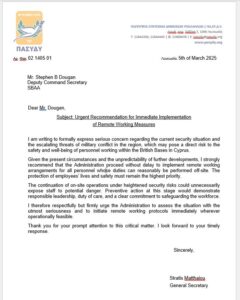 Σε γραπτή επιστολή προς τον Stephen B Dougan, Deputy Command Secretary, SBAA, διαμέσου του Γενικού Γραμματέα της συντεχνίας τονίζεται ότι το αίτημα υποβάλλεται δεδομένης της συνεχιζόμενης έκρυθμης κατάστασης στην περιοχή και της κλιμακούμενης ανησυχίας που επικρατεί.