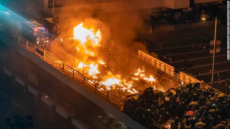 Διαδηλωτές βάζουν φωτιά στην είσοδο του Πολυεθνικού Πανεπιστημίου του Χονγκ Κονγκ σε μια προσπάθεια να εμποδίσουν τις αστυνομικές δυνάμεις από το να εισέλθουν στα κτίρια του πανεπιστημίου τα οποία φοιτητές μετέτρεψαν σε φρούριο. Η κατάληψη του Πανεπιστημίου συνεχίζεται για δεύτερη μέρα.