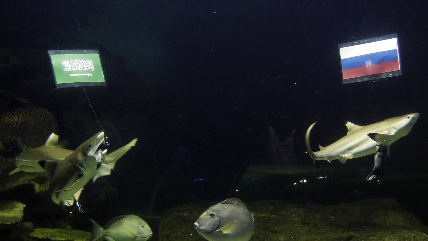 Ταϊλάνδη. Οι υπεύθυνοι του Chiang Mai Zoo χρησιμοποιούν ψάρια για να προβλέψουν το αποτέλεσμα του αγώνα μεταξύ Ρωσίας και Σαουδικής Αραβίας στο πλαίσιο της έναρξης του Μουντιάλ. Ένας μικρός καρχαρίας τρώει το δόλωμα που χρησιμοποιήθηκε με την σημαία της Σαουδικής Αραβίας προβλέποντας έτσι…ότι θα κερδίσει η Ρωσία.