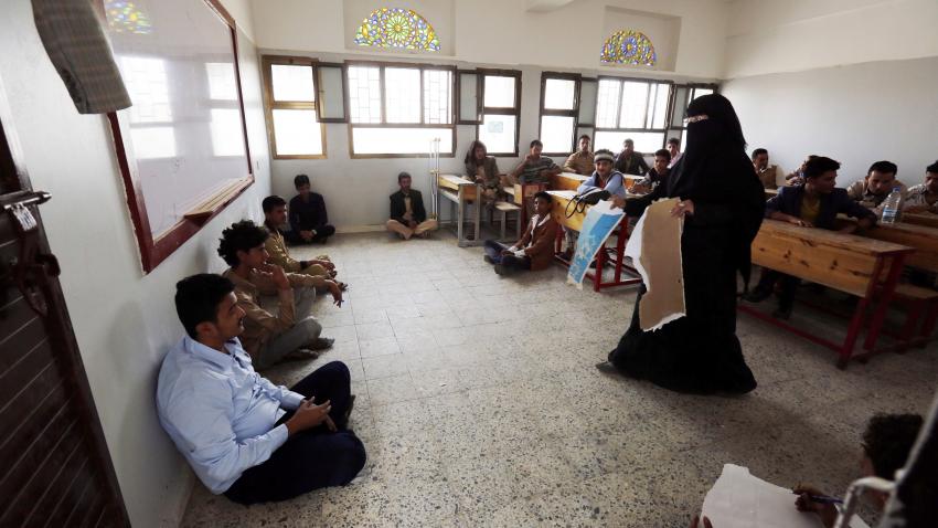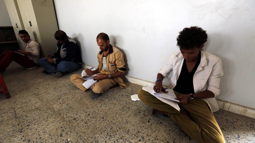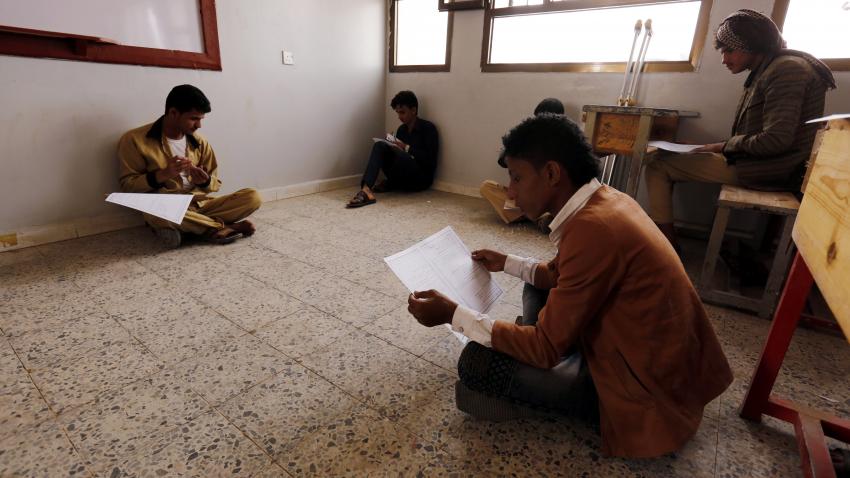Μαθητές-πρόσφυγες που αναγκάστηκαν να εγκαταλειψουν τα σπίτια τους λόγω της εμπόλεμης κατάστασης στην Υεμένη δίνουν τις τελικές τους εξετάσεις σε σχολείο στην Σανάα. Τουλάχιστον 200 μαθητές δίνουν εξετάσεις.