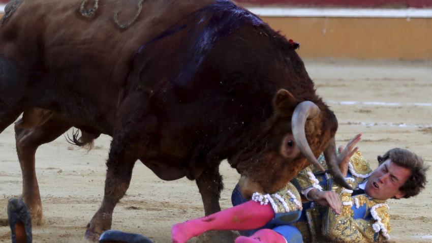 Ο Ισπανός ταυρομάχος Roman πέφτει στο έδαφος στη διάρκεια ταυρομαχίας στην πόλη Soria.