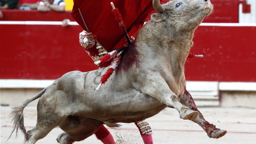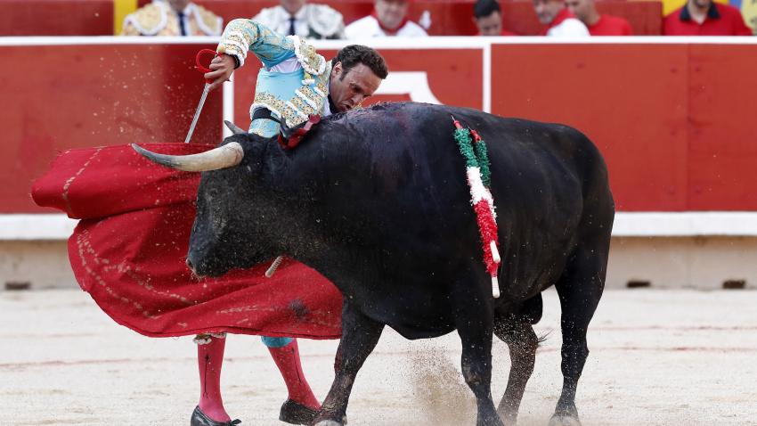 Ο Ισπανός ταυρομάχος Gine Marin αγωνίζεται στην Pamplona της Ισπανίας στη διάρκεια των εκδηλώσεων που λαμβάνουν χώρα αυτή τη βδομάδα.