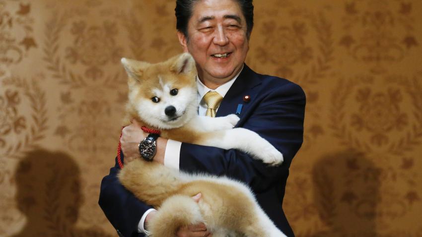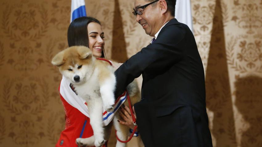 Ο επικεφαλής της προστασίας της φυλής Akita της Ιαπωνίας βρίσκεται στην αποστολή στη Ρωσία μαζί με τον Πρωθυπουργό της χώρας. Στη φωτογραφία ο Endo Takashi χαρίζει ένα σκυλάκι στην Ρωσίδα ολυμπιονίκη του πατινάζ Alina Zagitova.