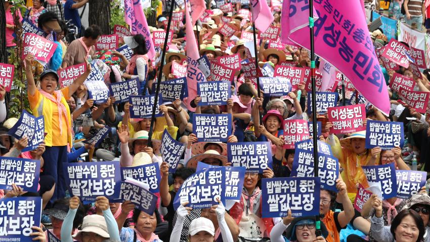 Γυναίκες στη Νότιο Κορέα που εργάζονται στη γεωργία, πραγματοποιούν διαμαρτυρία καλώντας την Κυβέρνηση να σταματήσει τις εισαγωγές ριζιού από το εξωτερικό.