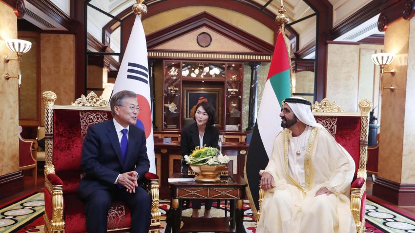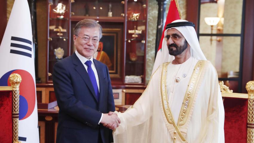 Ο Νοτιοκορεάτης Πρόεδρος Μουν πραγματοποιεί περιοδεία στα Ενωμένα Αραβικά Εμιράτα. Στη φωτογραφία με τον Πρωθυπουργό του Ντουνμπάι στο παλάτι της χώρας.