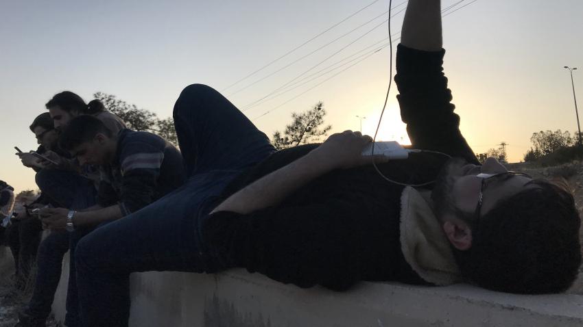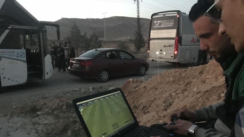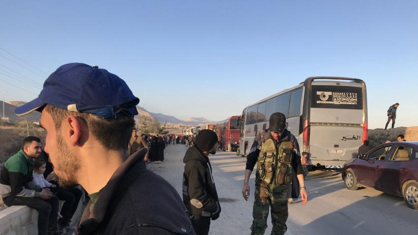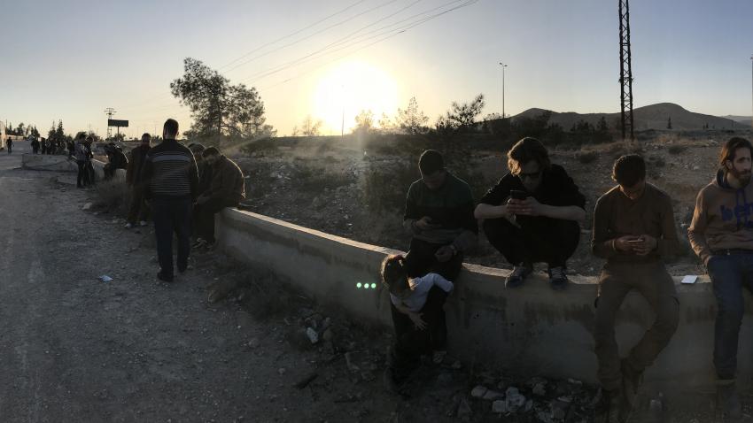 Σύροι πρόσφυγες εγκαταλείπουν την περιοχή Douma για να κατευθυνθούν προς το Ιντλίπ με λεωφορεία και άλλα οχήματα. Τουλάχιστον 24 λεωφορεία μετέφεραν 1146 πολίτες, μεταξύ των οποίων και τραυματίες από τη σύρραξη στην περιοχή. Στη φωτογραφία πολίτες παίζουν με τον φορητό τους υπολογιστή ευρισκόμενοι στην αναμονή….
