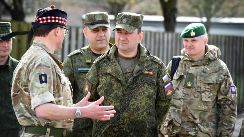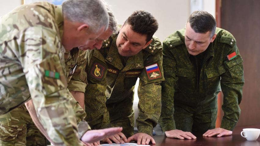Αξιωματικοί του βρετανικού στρατού ενημερώνουν συναδέλφους τους από τη Ρωσία και το Μπελαρούς για την κοινή στρατιωτική άσκηση Joint Warrior που θα πραγματοποιηθεί στη Σκωτία.