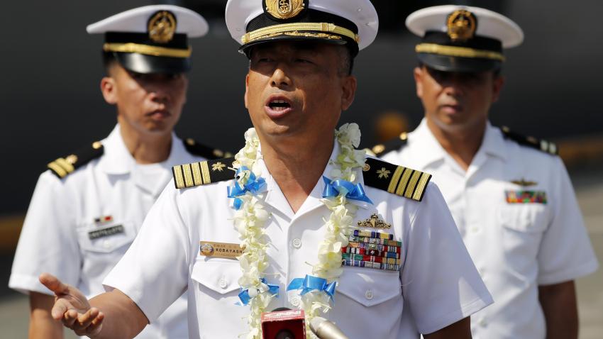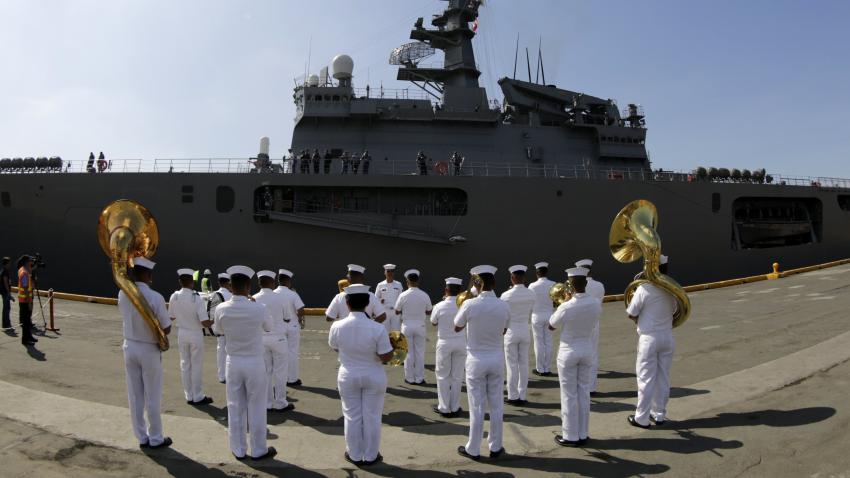 Μέλη του ιαπωνικού πολεμικού ναυτικού που στελεχώνουν το σκάφος JS Osumi φτάνουν στο Λιμάνι της Μανίλας των Φιλιππινών. Θα παραμείνουν εκεί για τρεις μέρες στο πλαίσιο της συνεργασίας των δύο χωρών.