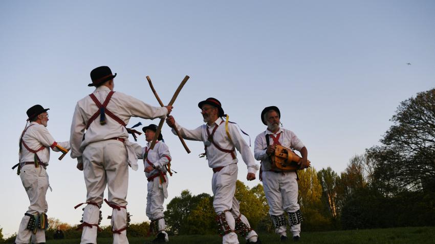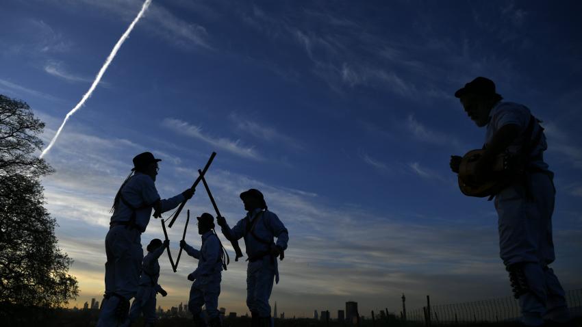 Στον λόφο Primrose του Λονδίνου, άνδρες χορεύουν τον παραδοσιακό χωρό Morris υποδεχόμενοι τον μήνα Μάιο.