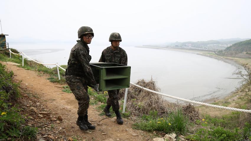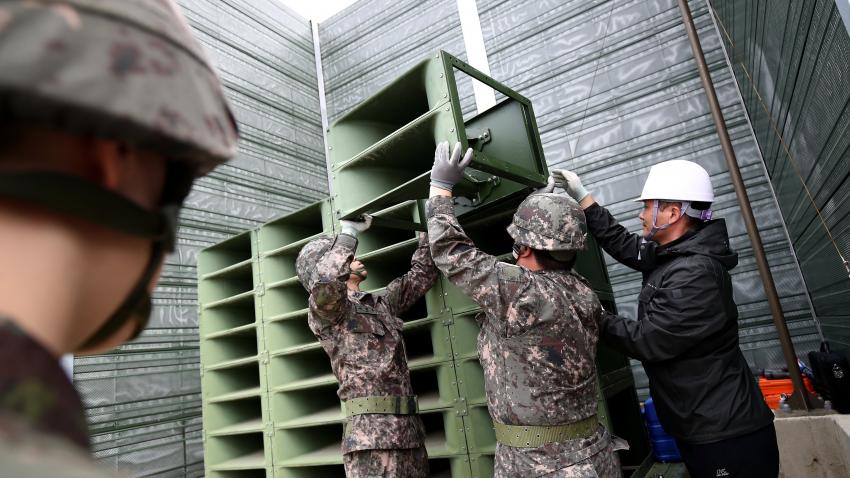 Στρατιώτες της Νοτίου Κορέας κατεβάζουν και αφαιρούν τα ηχεία που χρησιμοποιούνταν στα σύνορα με τη Βόρειο Κορέα για σκοπούς προπαγάνδας. Πρόκειται για το πρώτο βήμα αποκατάστασης των σχέσεων των δύο Κορέων μετά τις σημαντικές ανακοινώσεις που προέκυψαν την περασμένη βδομάδα στη διάρκεια της συνάντησης των ηγετών των δύο χωρών.