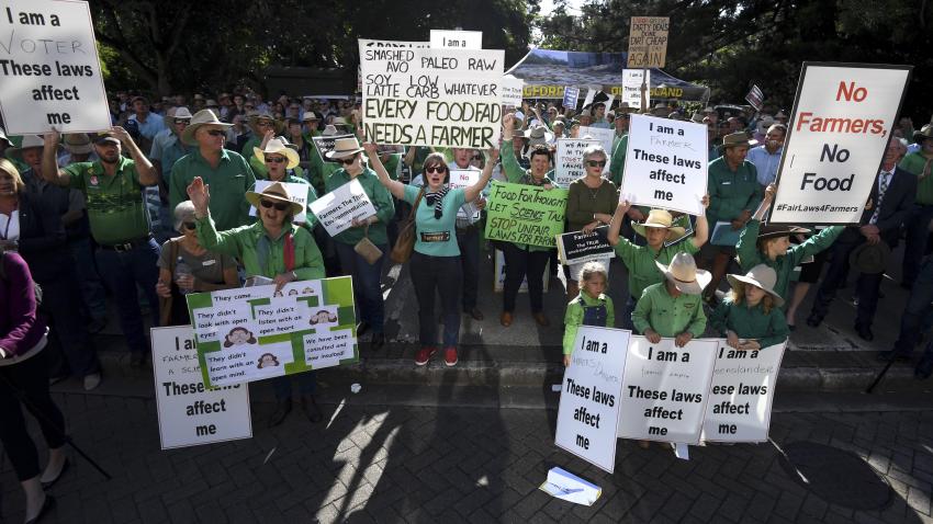 Αγρότες διαδηλώνουν έξω από το κτίριο του Κοινοβουλίου στην Αυστραλία κατά των νομοσχεδίων που προωθεί η κυβέρνηση για τη διαχείριση της βλάστησης.