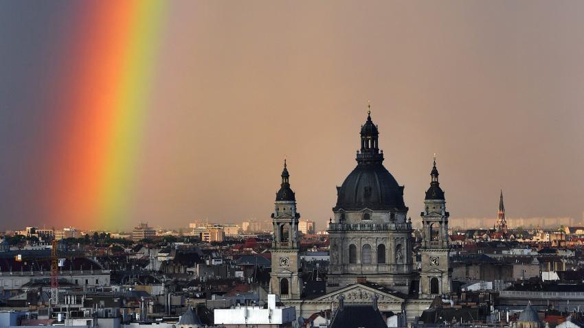 Μετά τη βροχή, ένα ουράνιο τόξο σχηματίζει αψίδα πάνω από τη Βουδαπέστη της Ουγγαρίας. Στα αριστερά ο Βασιλικός Ναός του Αγίου Στεφάνου.