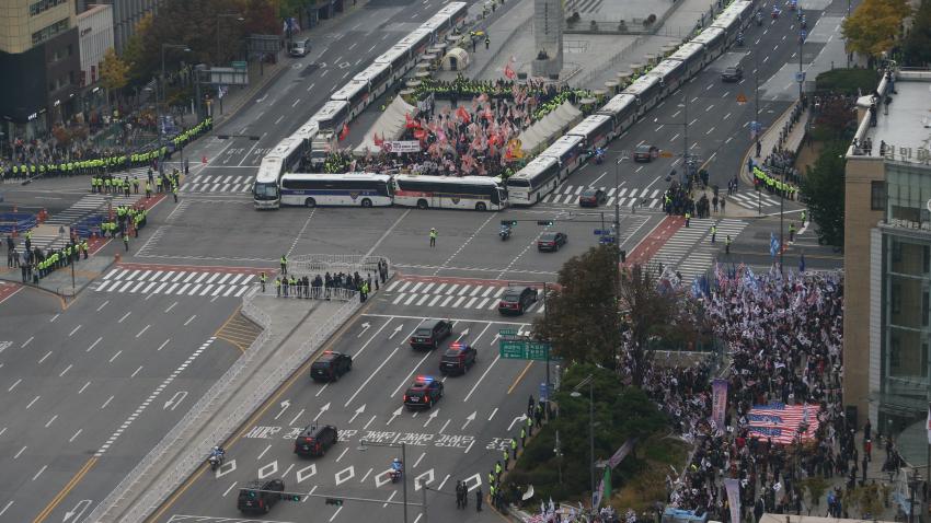 Στο μεταξύ στους δρόμους της Σεούλ πραγματοποιούνται εκδηλώσεις διαμαρτυρίας υπό δρακόντεια μέτρα ασφαλείας κατά της άφιξης Τραμπ.