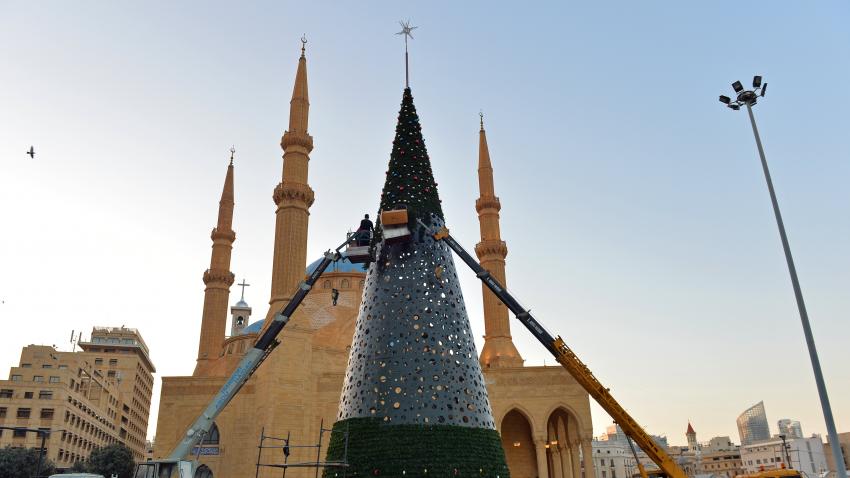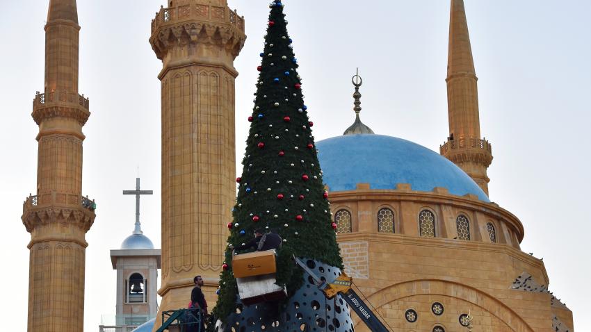 Ο ορισμός της πολυπολιτισμικότητας στη Βηρυτό. Προετοιμασίες για τα Χριστούγεννα με φόντο ένα τζαμί.