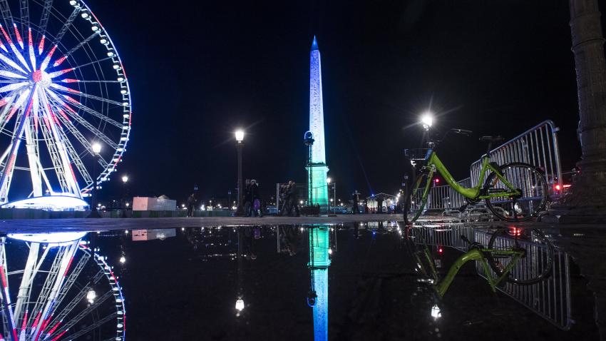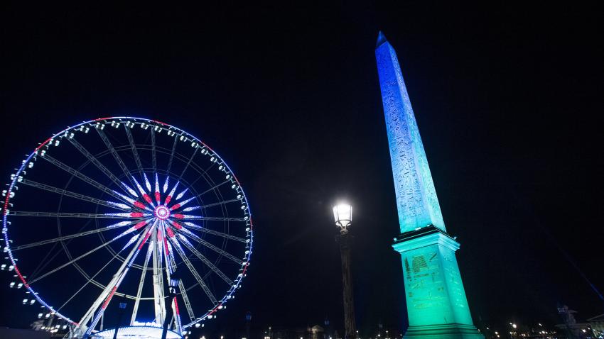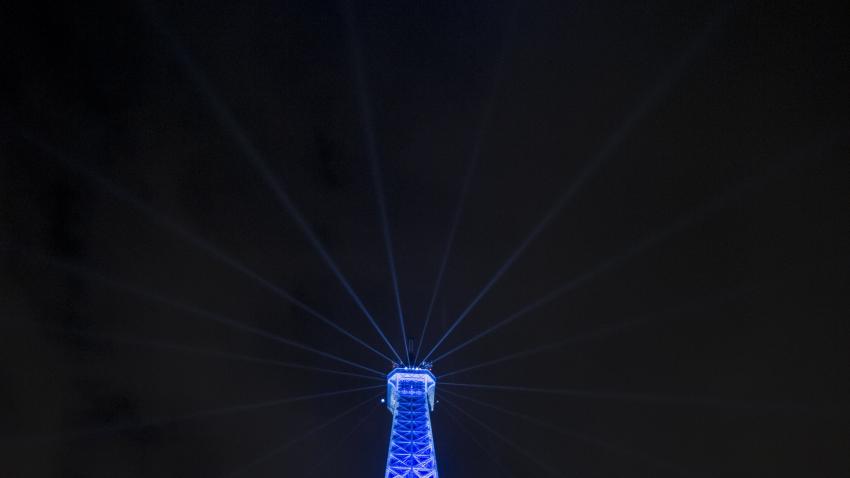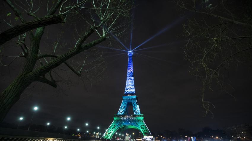 Ο πύργος του Άιφελ φωτισμένος στα πλαίσια της Συνόδου για τις κλιματικές αλλαγές.